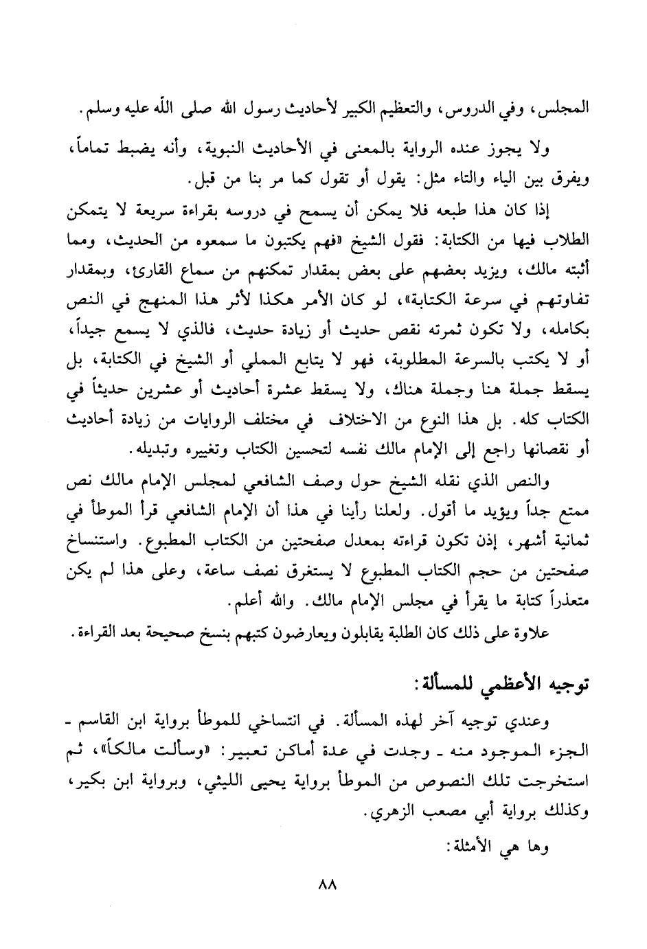 والنص الذي نقله الشيخ حول وصف الشافعي لمجلس الإمام مالك نص ممتع جداً ويؤيد ما أقول. ولعلنا رأينا في هذا أن الإمام الشافعي قرأ الموطأ في ثمانية أشهر، إذن تكون قراءته بمعدل صفحتين من الكتاب المطبوع. واستنساخ صفحتين من حجم الكتاب المطبوع لا يستغرق نصف ساعة، وعلى هذا لم يكن متعذراً كتابة ما يقرأ في مجلس الإمام مالك. والله أعلم.
