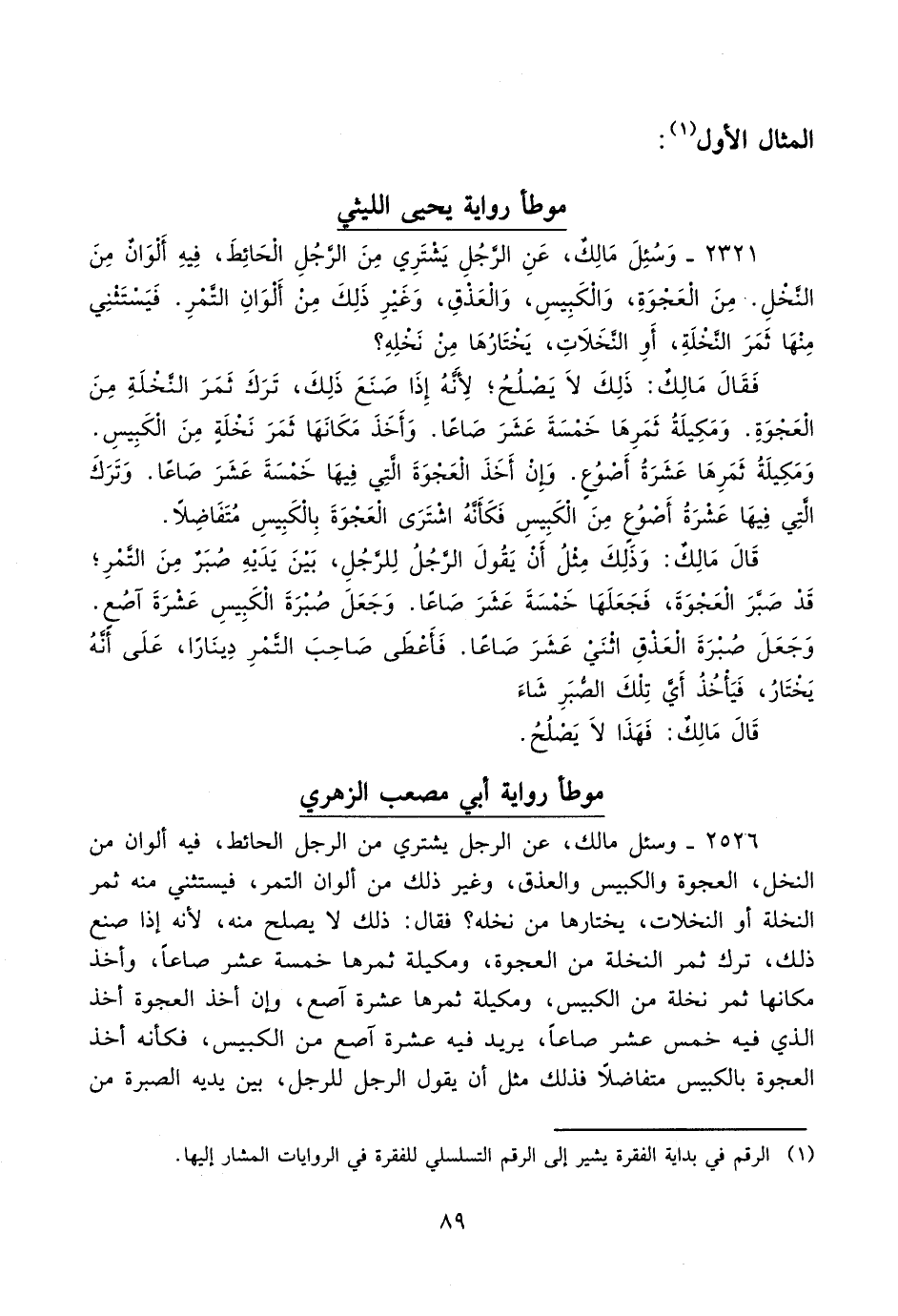 ٢٥٢٦ - وسئل مالك، عن الرجل يشتري من الرجل الحائط، فيه ألوان من النخل، العجوة والكبيس والعذق، وغير ذلك من ألوان التمر، فيستثني منه ثمر النخلة أو النخلات، يختارها من نخله؟ فقال: ذلك لا يصلح منه، لأنه إذا صنع ذلك، ترك ثمر النخلة من العجوة، ومكيلة ثمرها خمسة عشر صاعاً، وأخذ مكانها ثمر نخلة من الكبيس، ومكيلة ثمرها عشرة آصع، وإن أخذ العجوة أخذ الذي فيه خمس عشر صاعاً، يريد فيه عشرة آصع من الكبيس، فكأنه أخذ العجوة بالكبيس متفاضلاً فذلك مثل أن يقول الرجل للرجل، بين يديه الصبرة من