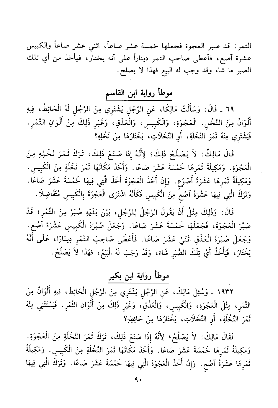 قَالَ مَالِكٌ: لَا يَصْلُحُ ذَلِكَ؛ لِأَنَّهُ إِذَا صَنَعَ ذَلِكَ، تَرَكَ ثَمَرَ نَخْلِهِ مِنَ الْعَجْوَةِ. وَمَكِيلَةُ ثَمَرِهَا خَمْسَةَ عَشَرَ صَاعاً. وَأَخَذَ مَكَانَهَا ثَمَرَ نَخْلَةٍ مِنَ الْكَبِيسِ. وَمَكِيلَةُ ثَمَرِهَا عَشَرَةُ أَصْوُعٍ. وَإِنْ أَخَذَ الْعَجْوَةَ أَخَذَ الَّتِي فِيهَا خَمْسَةَ عَشَرَ صَاعاً. وَتَرَكَ الَّتِي فِيهَا عَشْرَةُ آصُعٍ مِنَ الْكَبِيسِ فَكَأَنَّهُ اشْتَرَى الْعَجْوَةَ بِالْكَبِيسِ مُتَفَاضِلاً.