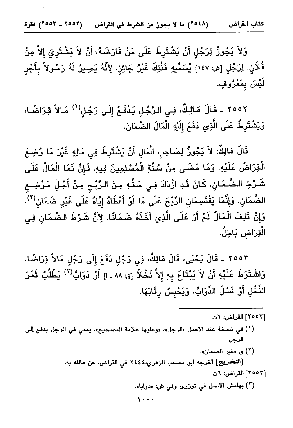 ٢٥٥٢ - قَالَ مَالِكٌ، فِي الرَّجُلِ يَدْفَعُ إِلَى رَجُلٍ (١) مَالاً قِرَاضاً، وَيَشْتَرِطُ عَلَى الَّذِي دَفَعَ إِلَيْهِ الْمَالَ الضَّمَانَ.
