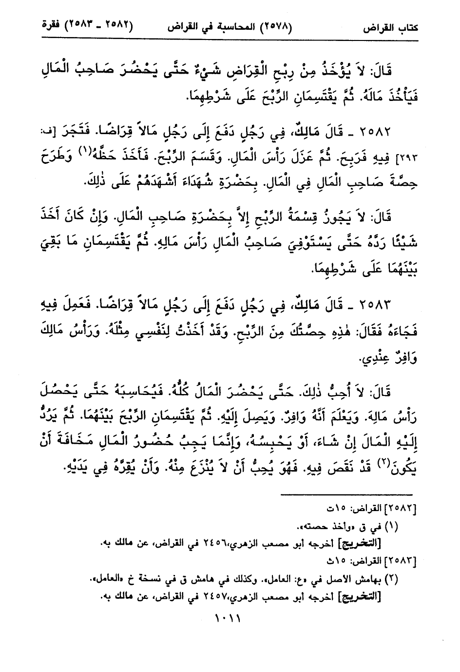 ٢٥٨٢ - قَالَ مَالِكٌ، فِي رَجُلٍ دَفَعَ إِلَى رَجُلٍ مَالاً قِرَاضاً. فَتَجَرَ [ف: ٢٩٣] فِيهِ فَرَبِحَ. ثُمَّ عَزَلَ رَأْسَ الْمَالِ. وَقَسَمَ الرِّبْحَ. فَأَخَذَ حَظَّهُ (١) وَطَرَحَ حِصَّةَ صَاحِبِ الْمَالِ فِي الْمَالِ. بِحَضْرَةِ شُهَدَاءَ أَشْهَدَهُمْ عَلَى ذلِكَ.