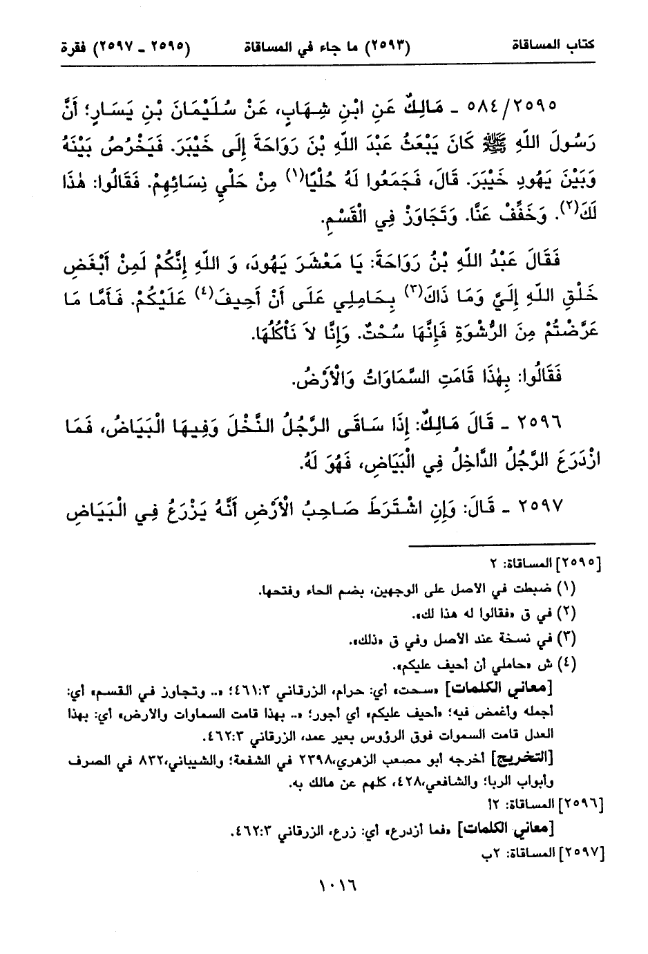 ٢٥٩٥/ ٥٨٤ - مَالِكٌ عَنِ ابْنِ شِهَابٍ، عَنْ سُلَيْمَانَ بْنِ يَسَارٍ؛ أَنَّ رَسُولَ اللهِ صلى الله عليه وسلم كَانَ يَبْعَثُ عَبْدَ اللهِ بْنَ رَوَاحَةَ إِلَى خَيْبَرَ. فَيَخْرُصُ بَيْنَهُ وَبَيْنَ يَهُودِ خَيْبَرَ. قَالَ، فَجَمَعُوا لَهُ حُلْياً (١) مِنْ حَلْيِ نِسَائِهِمْ. فَقَالُوا: هذَا لَكَ (٢). وَخَفِّفْ عَنَّا. وَتَجَاوَزْ فِي الْقَسْمِ.