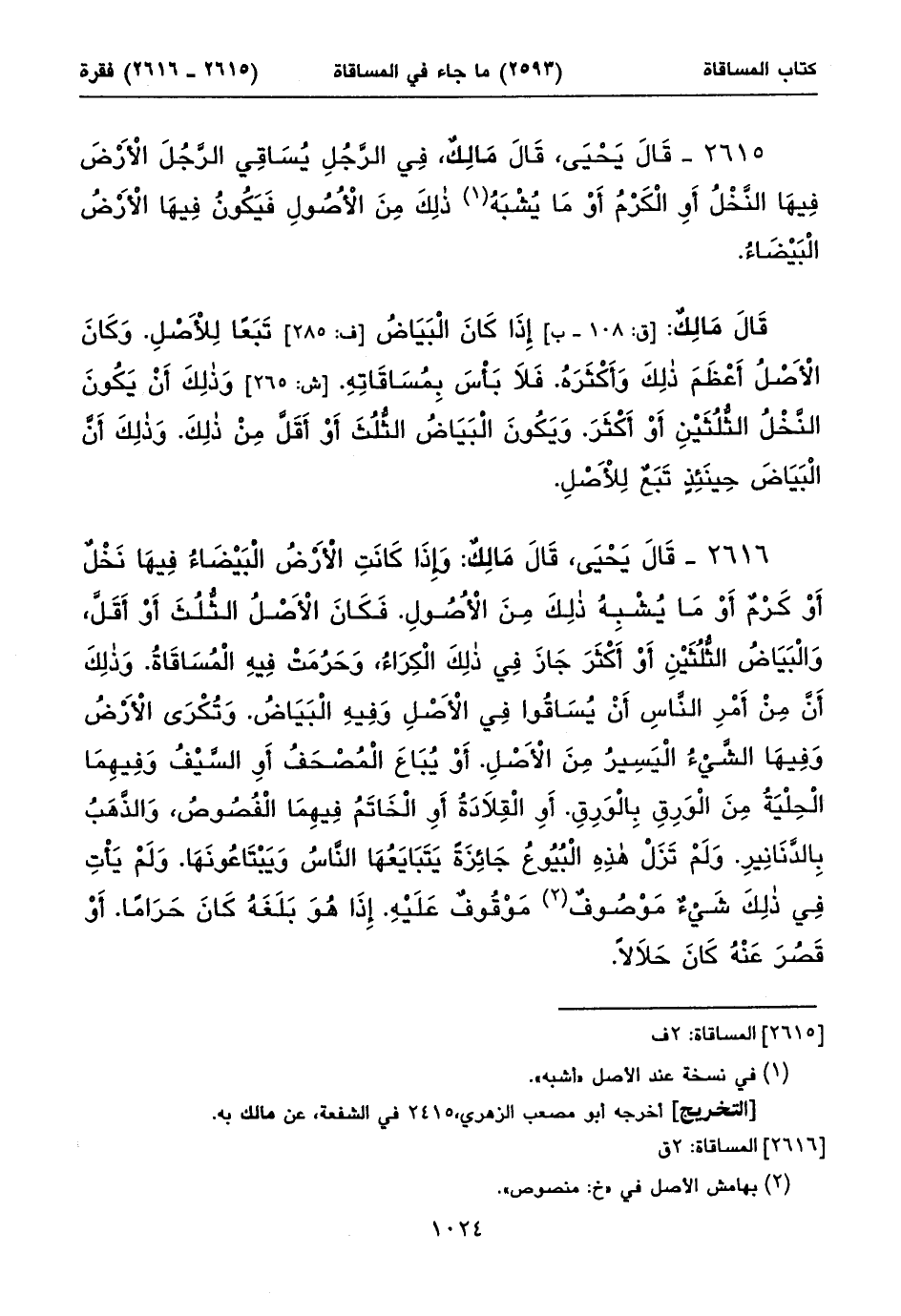 ٢٦١٥ - قَالَ يَحْيَى، قَالَ مَالِكٌ، فِي الرَّجُلِ يُسَاقِي الرَّجُلَ الْأَرْضَ فِيهَا النَّخْلُ أَوِ الْكَرْمُ أَوْ مَا يُشْبَهُ (١) ذلِكَ مِنَ الْأُصُولِ فَيَكُونُ فِيهَا الْأَرْضُ الْبَيْضَاءُ.