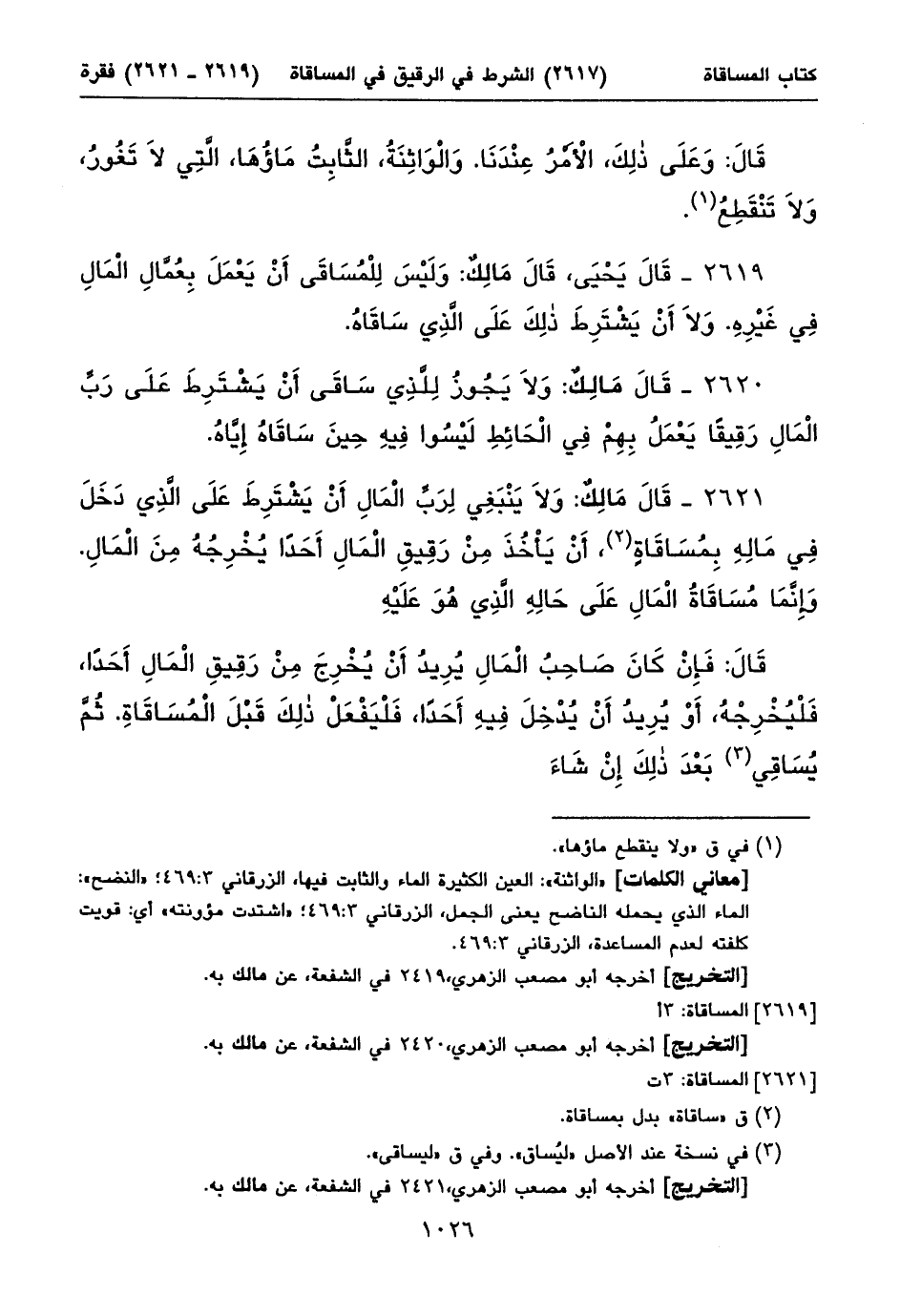 ٢٦٢١ - قَالَ مَالِكٌ: وَلَا يَنْبَغِي لِرَبِّ الْمَالِ أَنْ يَشْتَرِطَ عَلَى الَّذِي دَخَلَ فِي مَالِهِ بِمُسَاقَاةٍ (١)، أَنْ يَأْخُذَ مِنْ رَقِيقِ الْمَالِ أَحَداً يُخْرِجُهُ مِنَ الْمَالِ. وَإِنَّمَا مُسَاقَاةُ الْمَالِ عَلَى حَالِهِ الَّذِي هُوَ عَلَيْهِ