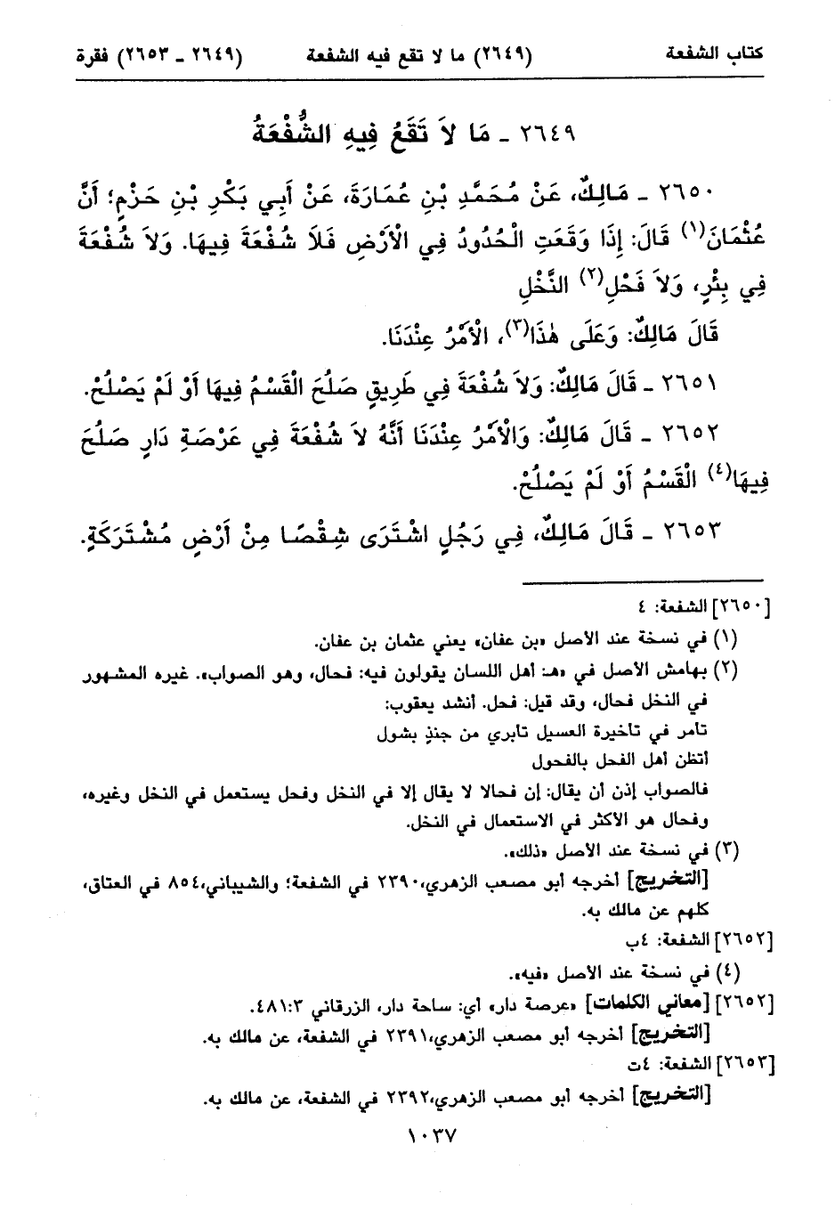 ٢٦٥٠ - مَالِكٌ، عَنْ مُحَمَّدِ بْنِ عُمَارَةَ، عَنْ أَبِي بَكْرِ بْنِ حَزْمٍ؛ أَنَّ عُثْمَانَ (١) قَالَ: إِذَا وَقَعَتِ الْحُدُودُ فِي الْأَرْضِ فَلَا شُفْعَةَ فِيهَا. وَلَا شُفْعَةَ فِي بِئْرٍ، وَلَا فَحْلِ (٢) النَّخْلِ