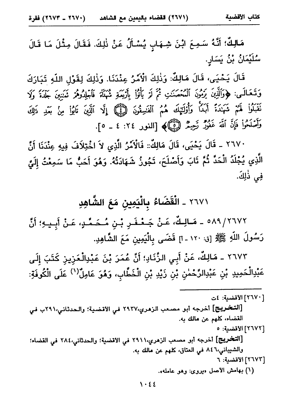 ٢٦٧٣ - مَالِكٌ، عَنْ أَبِي الزِّنَادِ؛ أَنَّ عُمَرَ بْنَ عَبْدِ الْعَزِيزِ كَتَبَ إِلَى عَبْدِ الْحَمِيدِ بْنِ عَبْدِ الرَّحْمنِ بْنِ زَيْدِ بْنِ الْخَطَّابِ، وَهُوَ عَامِلٌ (١) عَلَى الْكُوفَةِ: ⦗١٠٤٥⦘ أَنِ اقْضِ بِالْيَمِينِ مَعَ الشَّاهِدِ (٢).