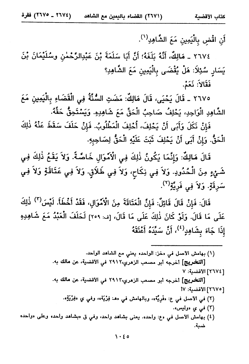 ٢٦٧٤ - مَالِكٌ، أَنَّهُ بَلَغَهُ؛ أَنَّ أَبَا سَلَمَةَ بْنَ عَبْدِ الرَّحْمنِ وسُلَيْمَانَ بْنَ يَسَارٍ سُئِلَا: هَلْ يُقْضَى بِالْيَمِينِ مَعَ الشَّاهِدِ؟