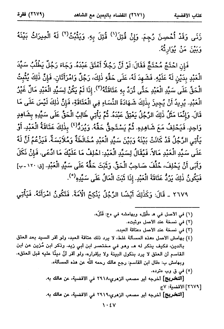 ٢٦٧٩ - قَالَ: وَكَذلِكَ أَيْضاً الرَّجُلُ يَنْكِحُ الْأَمَةَ. فَتَكُونُ امْرَأَتَهُ. فَيَأْتِي ⦗١٠٤٨⦘ سَيِّدُ الْأَمَةِ إِلَى الرَّجُلِ الَّذِي تَزَوَّجَهَا فَيَقُولُ: ابْتَعْتَ مِنِّي جَارِيَتِي فُلَانَةَ أَنْتَ، وَفُلَانٌ بِكَذَا وَكَذَا دِينَاراً. فَيُنْكِرُ ذلِكَ زَوْجُ الْأَمَةِ. فَيَأْتِي سَيِّدُ الْأَمَةِ برَجُلٍ وَامْرَأَتَيْنِ، فَيَشْهَدُونَ عَلَى مَا قَالَ. فَيَثْبُتُ بَيْعُهُ. وَيَحِقُّ حَقُّهُ. وَتَحْرُمُ الْأَمَةُ عَلَى زَوْجِهَا. وَيَكُونُ ذلِكَ فِرَاقاً بَيْنَهُمَا.