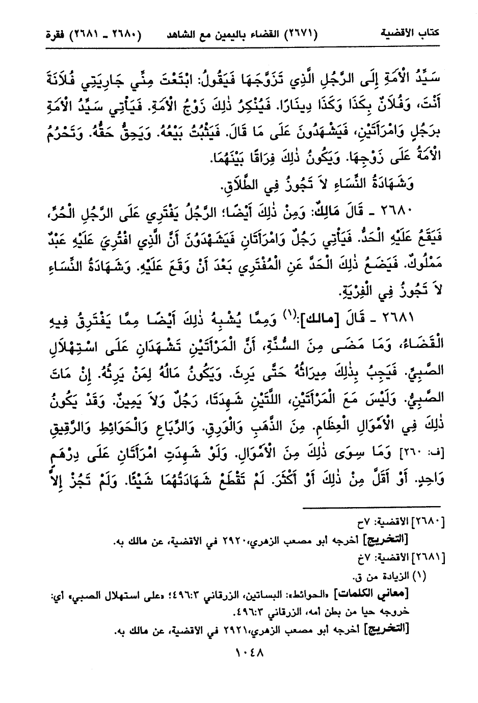 ٢٦٨١ - قَالَ [مالك]: (١) وَمِمَّا يُشْبِهُ ذلِكَ أَيْضاً مِمَّا يَفْتَرِقُ فِيهِ الْقَضَاءُ، وَمَا مَضَى مِنَ السُّنَّةِ، أَنَّ الْمَرْأَتَيْنِ تَشْهَدَانِ عَلَى اسْتِهْلَالِ الصَّبِيِّ. فَيَجِبُ بِذلِكَ مِيرَاثُهُ حَتَّى يَرِثَ. وَيَكُونُ مَالُهُ لِمَنْ يَرِثُهُ. إِنْ مَاتَ الصَّبِيُّ. وَلَيْسَ مَعَ الْمَرْأَتَيْنِ، اللَّتَيْنِ شَهِدَتَا، رَجُلٌ وَلَا يَمِينٌ. وَقَدْ يَكُونُ ذلِكَ فِي الْأَمْوَالِ الْعِظَامِ. مِنَ الذَّهَبِ وَالْوَرِقِ. وَالرِّبَاعِ وَالْحَوَائِطِ وَالرَّقِيقِ [ف: ٢٦٠] وَمَا سِوَى ذلِكَ مِنَ الْأَمْوَالِ. وَلَوْ شَهِدَتِ امْرَأَتَانِ عَلَى دِرْهَمٍ وَاحِدٍ. أَوْ أَقَلَّ مِنْ ذلِكَ أَوْ أَكْثَرَ. لَمْ تَقْطَعْ شَهَادَتُهُمَا شَيْئاً. وَلَمْ تَجُزْ إِلَاّ ⦗١٠٤٩⦘ أَنْ يَكُونَ مَعَهُمَا [ي: ٧٢ - ب] شَاهِدٌ أَوْ يَمِينٌ.