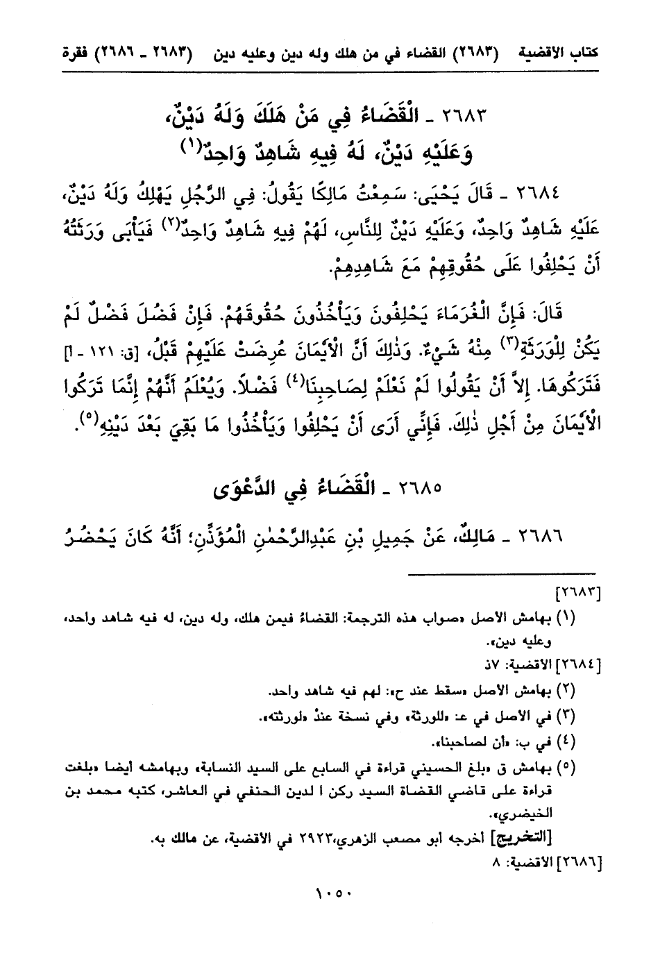 ٢٦٨٤ - قَالَ يَحْيَى: سَمِعْتُ مَالِكاً يَقُولُ: فِي الرَّجُلِ يَهْلِكُ وَلَهُ دَيْنٌ، عَلَيْهِ شَاهِدٌ وَاحِدٌ، وَعَلَيْهِ دَيْنٌ لِلنَّاسِ، لَهُمْ فِيهِ شَاهِدٌ وَاحِدٌ (١) فَيَأْبَى وَرَثَتُهُ أَنْ يَحْلِفُوا عَلَى حُقُوقِهِمْ مَعَ شَاهِدِهِمْ.