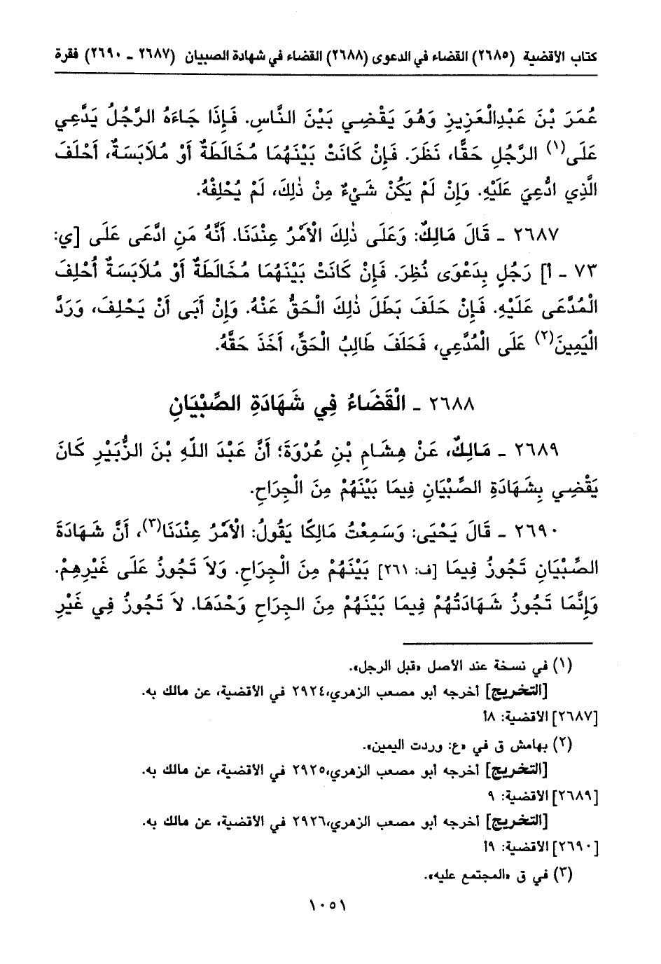 ٢٦٨٩ - مَالِكٌ، عَنْ هِشَامِ بْنِ عُرْوَةَ؛ أَنَّ عَبْدَ اللهِ بْنَ الزُّبَيْرِ كَانَ يَقْضِي بِشَهَادَةِ الصِّبْيَانِ فِيمَا بَيْنَهُمْ مِنَ الْجِرَاحِ.