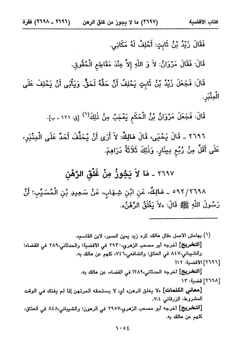٢٦٩٨/ ٥٩٢ - مَالِكٌ، عَنِ ابْنِ شِهَابٍ، عَنْ سَعِيدِ بْنِ الْمُسَيَّبِ؛ أَنَّ رَسُولَ اللهِ صلى الله عليه وسلم قَالَ: «لَا يَغْلَقُ الرَّهْنُ».