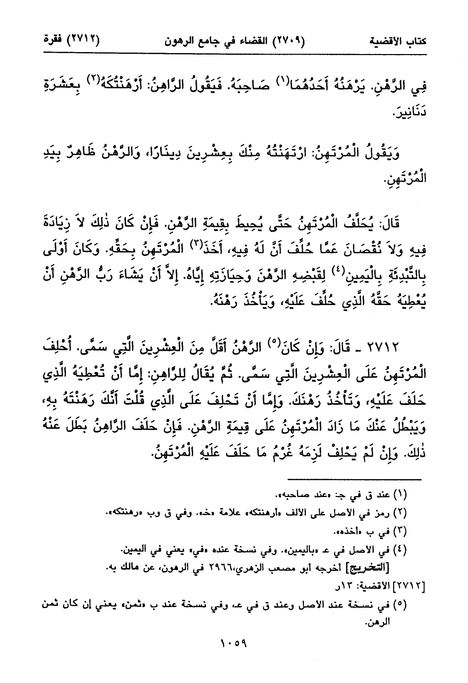 ٢٧١٢ - قَالَ: وَإِنْ كَانَ (١) الرَّهْنُ أَقَلَّ مِنَ الْعِشْرِينَ الَّتِي سَمَّى. أُحْلِفَ الْمُرْتَهِنُ عَلَى الْعِشْرِينَ الَّتِي سَمَّى. ثُمَّ يُقَالُ لِلرَّاهِنِ: إِمَّا أَنْ تُعْطِيَهُ الَّذِي حَلَفَ عَلَيْهِ، وَتَأْخُذُ رَهْنَكَ. وَإِمَّا أَنْ تَحْلِفَ عَلَى الَّذِي قُلْتَ أَنَّكَ رَهَنْتَهُ بِهِ، وَيَبْطُلُ عَنْكَ مَا زَادَ الْمُرْتَهِنُ عَلَى قِيمَةِ الرَّهْنِ. فَإِنْ حَلَفَ الرَّاهِنُ بَطَلَ عَنْهُ ذلِكَ. وَإِنْ لَمْ يَحْلِفْ لَزِمَهُ غُرْمُ مَا حَلَفَ عَلَيْهِ الْمُرْتَهِنُ.