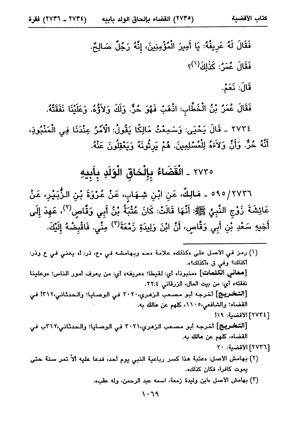 «الولد للفراش» أي: الولد للحالة التى يمكن فيها الافتراش، الزرقاني ٤: ٢٧؛ «وللعاهر الحجر» أي: وللزانى الخيبة ولا حق له في الولد؛ «عهد إلى أخيه .. » أي: أوصى، الزرقاني ٤: ٢٤؛ «فتساوقا» أي: تدافعا بعد تخاصمها وتنازعهما في الولد، الزرقاني ٤: ٢٥؛ «احتجبى منه» أي: من عبد الرحمن؛ «قالت .. » أي: عائشة، الزرقاني ٤: ٢٨؛ «وليدة أبي» أي: جاريته.
