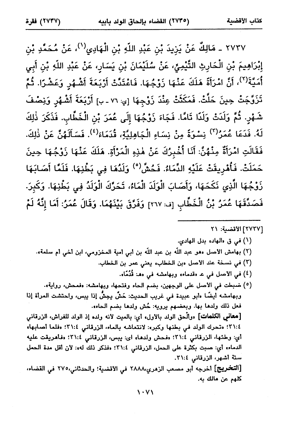 «وألْحق الولد بالأول» أي: بالميت لأنه ولده إذ الولد للفراش، الزرقاني ٤: ٣١؛ «تحرك الولد في بطنها وكبر»: لانتعاشه بالماء، الزرقاني ٤: ٣١؛ «فلما أصابها» أي: وطئها، الزرقاني ٤: ٣١؛ «فحش ولدها» اى: يبس، الزرقاني ٤: ٣١؛ «فأهريقت عليه الدماء» أي: صبت بكثرة على الحمل، الزرقاني ٤: ٣١؛ «فذكر ذلك له»: لأن أقل مدة الحمل ستة أشهر، الزرقاني ٤: ٣١