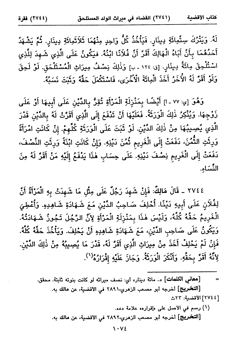 ٢٧٤٤ - قَالَ مَالِكٌ: فَإِنْ شَهِدَ رَجُلٌ عَلَى مِثْلِ مَا شَهِدَتْ بِهِ الْمَرْأَةُ أَنَّ لِفُلَانٍ عَلَى أَبِيهِ دَيْناً. أُحْلِفَ صَاحِبُ الدَّيْنِ مَعَ شَهَادَةِ شَاهِدِهِ. وَأُعْطِيَ الْغَرِيمُ حَقَّهُ كُلَّهُ، وَلَيْسَ هذَا بِمَنْزِلَةِ الْمَرْأَةِ لِأَنَّ الرَّجُلَ تَجُوزُ شَهَادَتُهُ. وَيَكُونُ عَلَى صَاحِبِ الدَّيْنِ، مَعَ شَهَادَةِ شَاهِدِهِ أَنْ يَحْلِفَ. وَيَأْخُذَ حَقَّهُ كُلَّهُ. فَإِنْ لَمْ يَحْلِفْ أَخَذَ مِنْ مِيرَاثِ الَّذِي أَقَرَّ لَهُ، قَدْرَ مَا يُصِيبُهُ مِنْ ذلِكَ الدَّيْنِ. لِأَنَّهُ أَقَرَّ بِحَقِّهِ. وَأَنْكَرَ الْوَرَثَةُ. وَجَازَ عَلَيْهِ إِقْرَارُهُ (١).