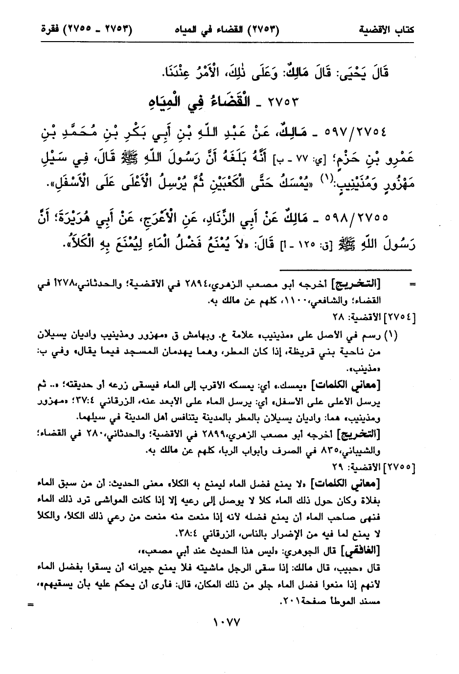 «يمسك.» أي: يمسكه الأقرب إلى الماء فيسقى زرعه أو حديقته؛ « .. ثم يرسل الأعلى على الأسفل» أي: يرسل الماء على الأبعد عنه، الزرقاني ٤: ٣٧؛ «مهزور ومذينيب» هما: واديان يسيلان بالمطر بالمدينة يتنافس أهل المدينة في سيلهما.