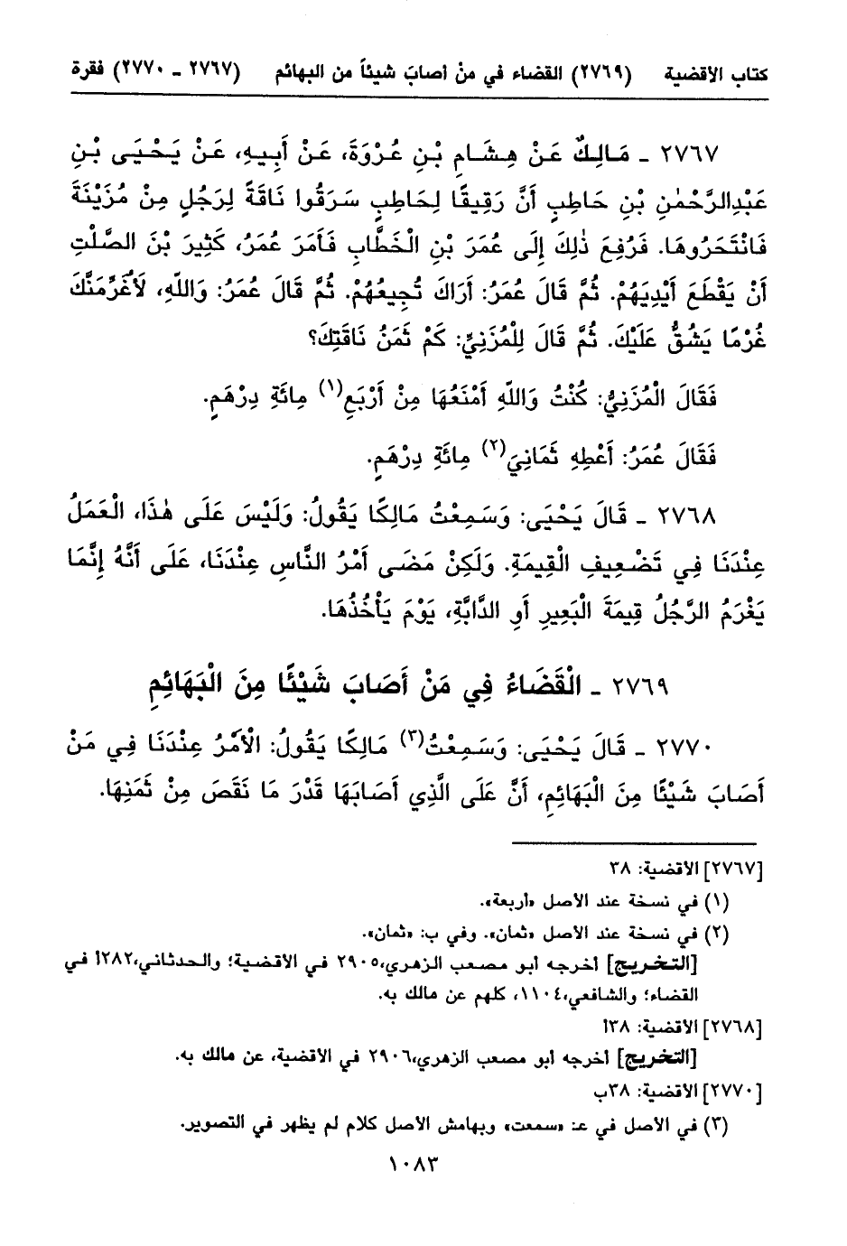 ٢٧٦٧ - مَالِكٌ عَنْ هِشَامِ بْنِ عُرْوَةَ، عَنْ أَبِيهِ، عَنْ يَحْيَى بْنِ عَبْدِ الرَّحْمنِ بْنِ حَاطِبٍ أَنَّ رَقِيقاً لِحَاطِبٍ سَرَقُوا نَاقَةً لِرَجُلٍ مِنْ مُزَيْنَةَ فَانْتَحَرُوهَا. فَرُفِعَ ذلِكَ إِلَى عُمَرَ بْنِ الْخَطَّابِ فَأَمَرَ عُمَرُ، كَثِيرَ بْنَ الصَّلْتِ أَنْ يَقْطَعَ أَيْدِيَهُمْ. ثُمَّ قَالَ عُمَرُ: أَرَاكَ تُجِيعُهُمْ. ثُمَّ قَالَ عُمَرُ: وَاللهِ، لأُغَرِّمَنَّكَ غُرْماً يَشُقُّ عَلَيْكَ. ثُمَّ قَالَ لِلْمُزَنِيِّ: كَمْ ثَمَنُ نَاقَتِكَ؟