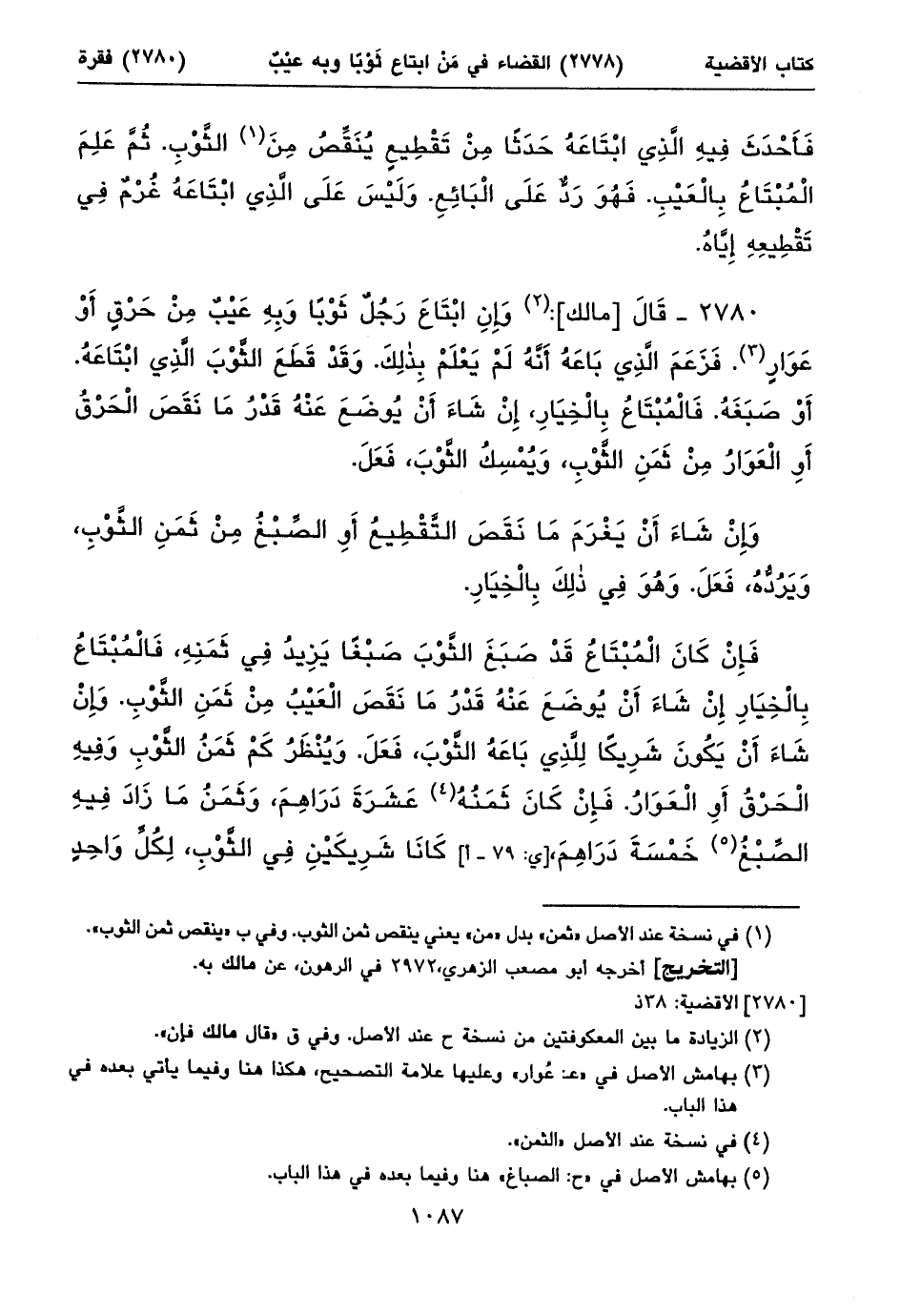 ٢٧٨٠ - قَالَ [مالك]: (١) وَإِنِ ابْتَاعَ رَجُلٌ ثَوْباً وَبِهِ عَيْبٌ مِنْ حَرْقٍ أَوْ عَوَارٍ (٢). فَزَعَمَ الَّذِي بَاعَهُ أَنَّهُ لَمْ يَعْلَمْ بِذلِكَ. وَقَدْ قَطَعَ الثَّوْبَ الَّذِي ابْتَاعَهُ. أَوْ صَبَغَهُ. فَالْمُبْتَاعُ بِالْخِيَارِ، إِنْ شَاءَ أَنْ يُوضَعَ عَنْهُ قَدْرُ مَا نَقَصَ الْحَرْقُ أَوِ الْعَوَارُ مِنْ ثَمَنِ الثَّوْبِ، وَيُمْسِكُ الثَّوْبَ، فَعَلَ.