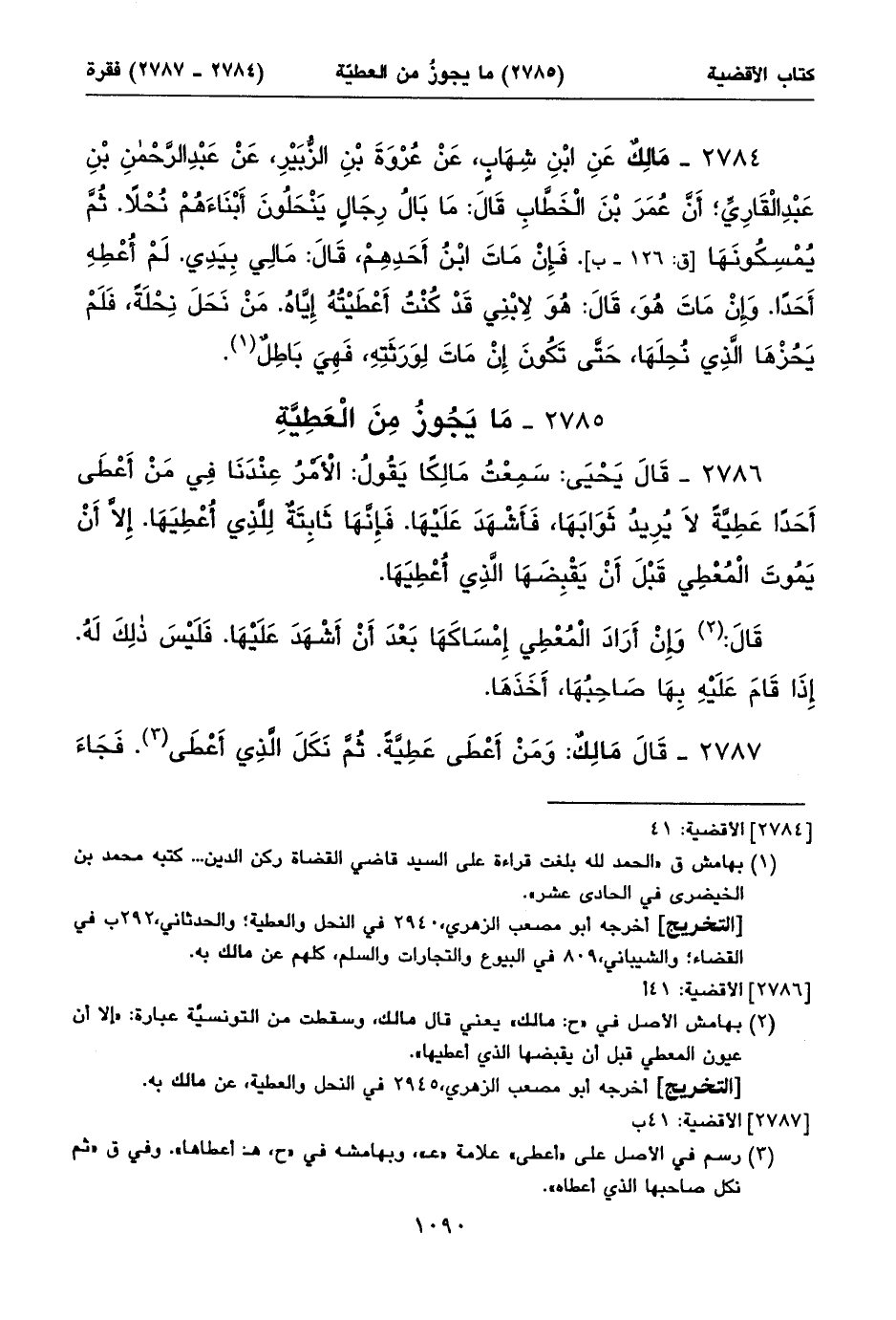 (١) بهامش الأصل في «ح: مالك» يعني قال مالك، وسقطت من التونسيَّة عبارة: «إلا أن عيون المعطي قبل أن يقبضها الذي أعطيها».
