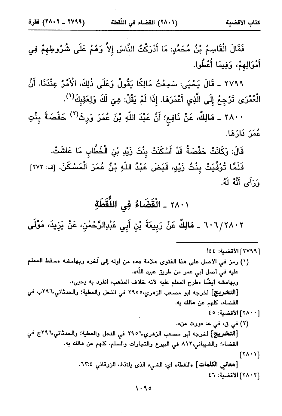 أخرجه أبو مصعب الزهري، ٢٩٧٥ في الرهون؛ والحدثاني، ٢٩٨ في القضاء؛ والشافعي، ١٠٨٨؛ والبخاري، ٢٣٧٢ في المساقاة عن طريق إسماعيل، وفي، ٢٤٢٩ في اللقطة عن طريق عبد الله بن يوسف؛ ومسلم، اللقطة: ١ عن طريق يحيى بن يحيى التميمي؛ وأبو داود، ١٧٠٥ في اللقطة عن طريق ابن السرح عن ابن وهب؛ وابن حبان، ٤٨٨٩ في م١١ عن طريق الحسين بن إدريس الأنصاري عن أحمد بن أبي بكر، وفي، ٤٨٩٨ في م١١ عن طريق الحسين بن أدريس الأنصاري عن أحمد بن أبي بكر؛ والقابسي، ١٦٣، كلهم عن مالك به.