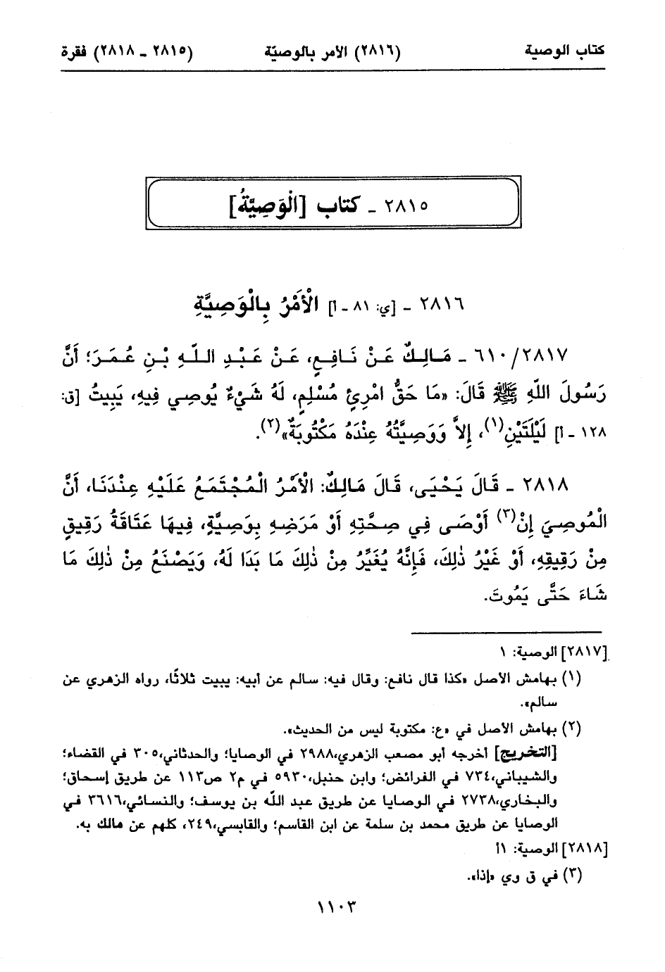 ٢٨١٧/ ٦١٠ - مَالِكٌ عَنْ نَافِعٍ، عَنْ عَبْدِ اللهِ بْنِ عُمَرَ؛ أَنَّ رَسُولَ اللهِ صلى الله عليه وسلم قَالَ: «مَا حَقُّ امْرِئٍ مُسْلِمٍ، لَهُ شَيْءٌ يُوصِي فِيهِ، يَبِيتُ [ق: ١٢٨ - أ] لَيْلَتَيْنِ (١)، إِلَاّ وَوَصِيَّتُهُ عِنْدَهُ مَكْتُوبَةٌ» (٢).