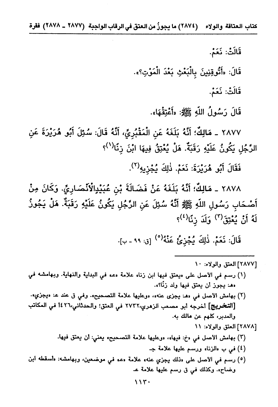 ٢٨٧٧ - مَالِكٌ؛ أَنَّهُ بَلَغَهُ عَنِ الْمَقْبُرِيِّ، أَنَّهُ قَالَ: سُئِلَ أَبُو هُرَيْرَةَ عَنِ الرَّجُلِ يَكُونُ عَلَيْهِ رَقَبَةٌ. هَلْ يُعْتِقُ فِيهَا ابْنَ زِناً (١)؟
