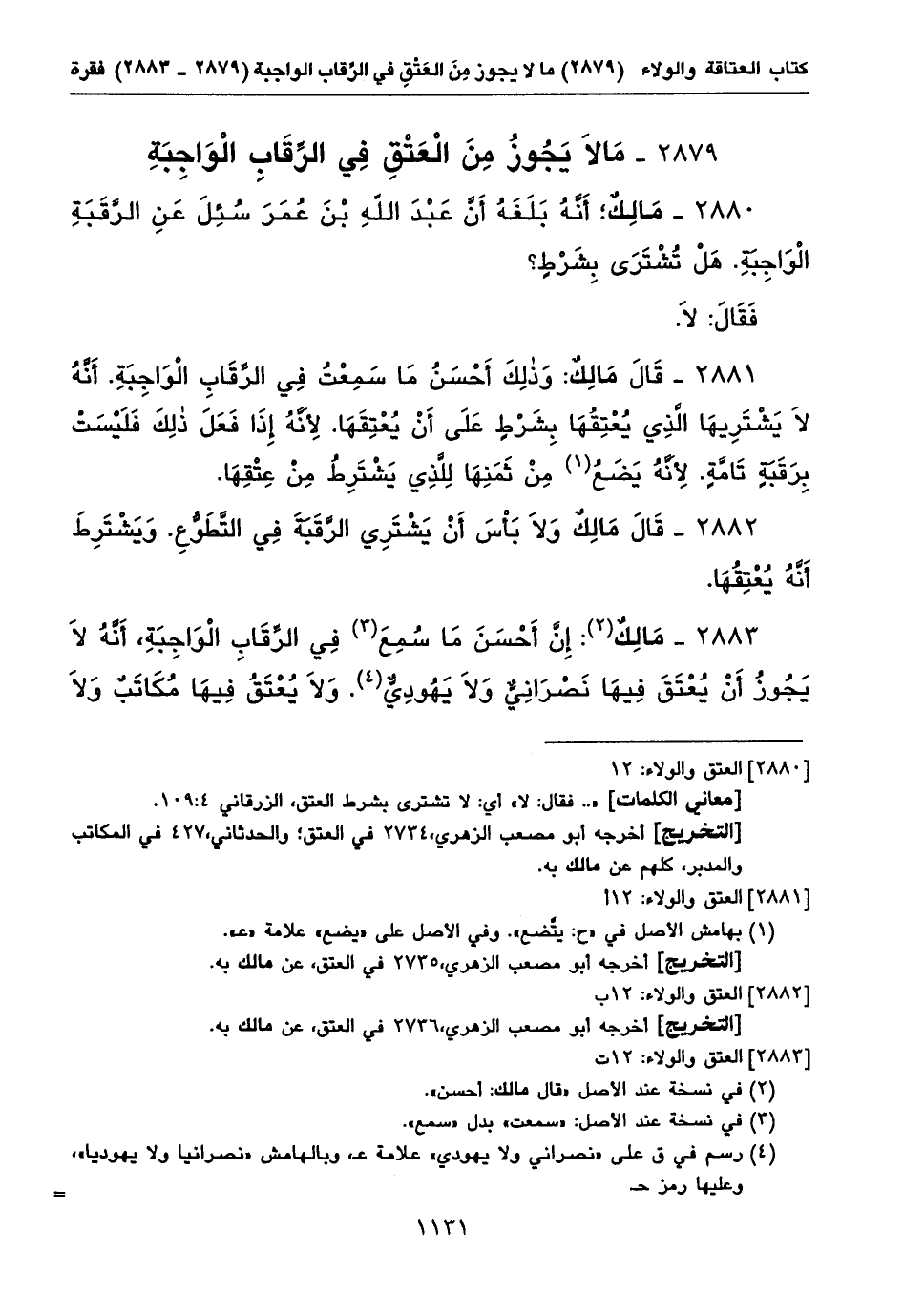 ٢٨٨٠ - مَالِكٌ؛ أَنَّهُ بَلَغَهُ أَنَّ عَبْدَ اللهِ بْنَ عُمَرَ سُئِلَ عَنِ الرَّقَبَةِ الْوَاجِبَةِ. هَلْ تُشْتَرَى بِشَرْطٍ؟