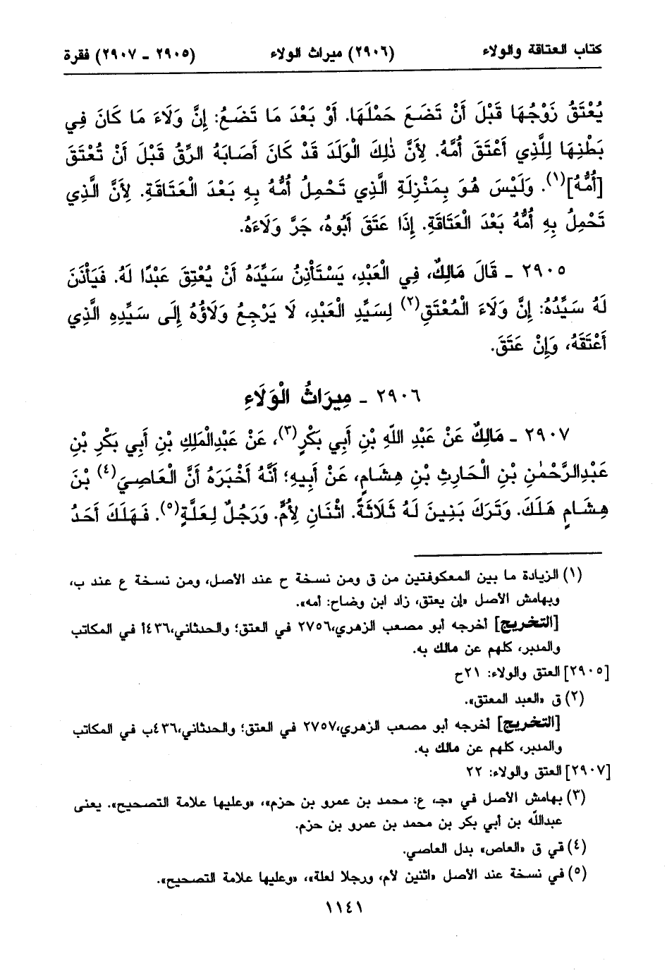 ٢٩٠٧ - مَالِكٌ عَنْ عَبْدِ اللهِ بْنِ أَبِي بَكْرٍ (١)، عَنْ عَبْدِ الْمَلِكِ بْنِ أَبِي بَكْرِبْنِ عَبْدِ الرَّحْمنِ بْنِ الْحَارِثِ بْنِ هِشَامٍ، عَنْ أَبِيهِ؛ أَنَّهُ أَخْبَرَهُ أَنَّ الْعَاصِيَ (٢) بْنَ هِشَامٍ هَلَكَ. وَتَرَكَ بَنِينَ لَهُ ثَلَاثَةً. اثْنَانِ لِأُمٍّ. وَرَجُلٌ لِعَلَّةٍ (٣). فَهَلَكَ أَحَدُ ⦗١١٤٢⦘ اللَّذَيْنِ لِأُمٍّ. وَتَرَكَ مَالاً وَمَوَالِيَ. فَوَرِثَهُ أَخُوهُ لِأَبِيهِ وَأُمِّهِ مَالَهُ وَمَوَالِيهِ (٤). ثُمَّ هَلَكَ الَّذِي وَرِثَ الْمَالَ وَوَلَاءَ الْمَوَالِي. وَتَرَكَ ابْنَهُ وَأَخَاهُ لِأَبِيهِ: فَقَالَ ابْنُهُ: قَدْ [ف: ١٧٨] أَحْرَزْتُ مَا كَانَ أَبِي أَحْرَزَ مِنَ الْمَالِ وَوَلَاءِ الْمَوَالِي. وَقَالَ أَخُوهُ: لَيْسَ كَذلِكَ. إِنَّمَا أَحْرَزْتَ الْمَالَ. وَأَمَّا وَلَاءُ الْمَوَالِي فَلَا. أَرَأَيْتَ لَوْ هَلَكَ أَخِي الْيَوْمَ أَلَسْتُ أَرِثُهُ أَنَا؟ فَاخْتَصَمَا إِلَى عُثْمَانَ بْنِ عَفَّانَ. فَقَضَى لِأَخِيهِ بِوَلَاءِ الْمَوَالِي.