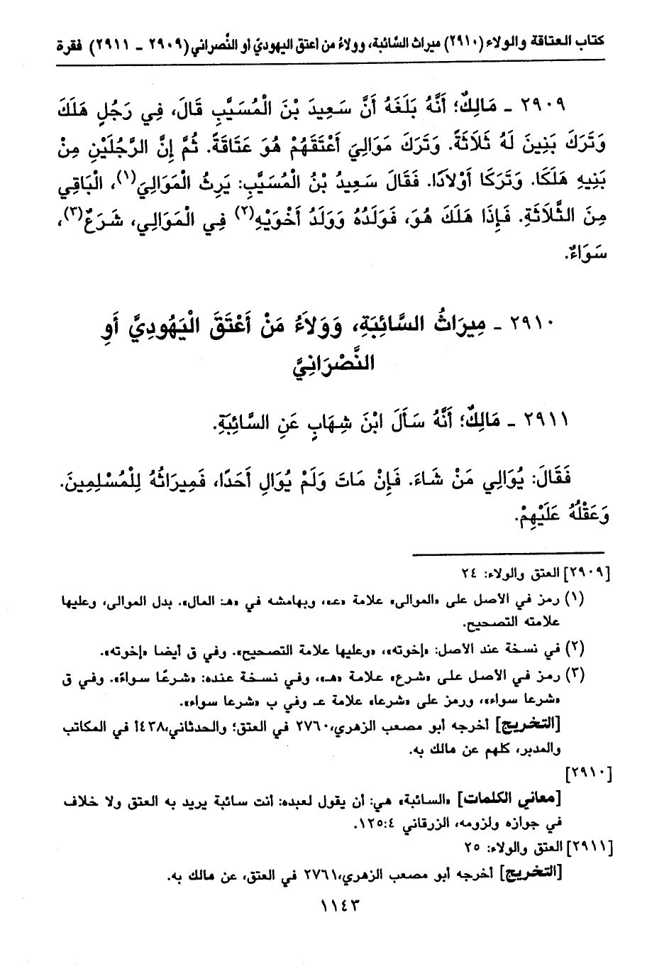 ٢٩٠٩ - مَالِكٌ؛ أَنَّهُ بَلَغَهُ أَنَّ سَعِيدَ بْنَ الْمُسَيَّبِ قَالَ، فِي رَجُلٍ هَلَكَ وَتَرَكَ بَنِينَ لَهُ ثَلَاثَةً. وَتَرَكَ مَوَالِيَ أَعْتَقَهُمْ هُوَ عَتَاقَةً. ثُمَّ إِنَّ الرَّجُلَيْنِ مِنْ بَنِيهِ هَلَكَا. وَتَرَكَا أَوْلَاداً. فَقَالَ سَعِيدُ بْنُ الْمُسَيَّبِ: يَرِثُ الْمَوَالِيَ (١)، الْبَاقِي مِنَ الثَّلَاثَةِ. فَإِذَا هَلَكَ هُوَ، فَوَلَدُهُ وَوَلَدُ أَخْوَيْهِ (٢) فِي الْمَوَالِي، شَرَعٌ (٣)، سَوَاءٌ.