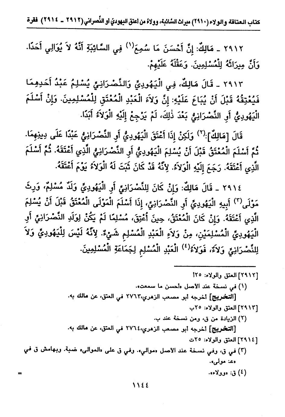 ٢٩١٤ - قَالَ مَالِكٌ: وَإِنْ كَانَ لِلنَّصْرَانِيِّ أَوِ الْيَهُودِيِّ وَلَدٌ مُسْلِمٌ، وَرِثَ مَوْلَى (١) أَبِيهِ الْيَهُودِيِّ أَوِ النَّصْرَانِيِّ، إِذَا أَسْلَمَ الْمَوْلَى الْمُعْتَقُ قَبْلَ أَنْ يُسْلِمَ الَّذِي أَعْتَقَهُ. وَإِنْ كَانَ الْمُعْتَقُ، حِينَ أُعْتِقَ، مُسْلِماً لَمْ يَكُنْ لِوَلَدِ النَّصْرَانِيِّ أَوِ الْيَهُودِيِّ الْمُسْلِمَيْنِ، مِنْ وَلَاءِ الْعَبْدِ الْمُسْلِمِ شَيْءٌ. لِأَنَّهُ لَيْسَ لِلْيَهُودِيِّ وَلَا لِلنَّصْرَانِيِّ وَلَاءٌ، فَوَلَاءُ (٢) الْعَبْدِ الْمُسْلِمِ لِجَمَاعَةِ الْمُسْلِمِينَ.