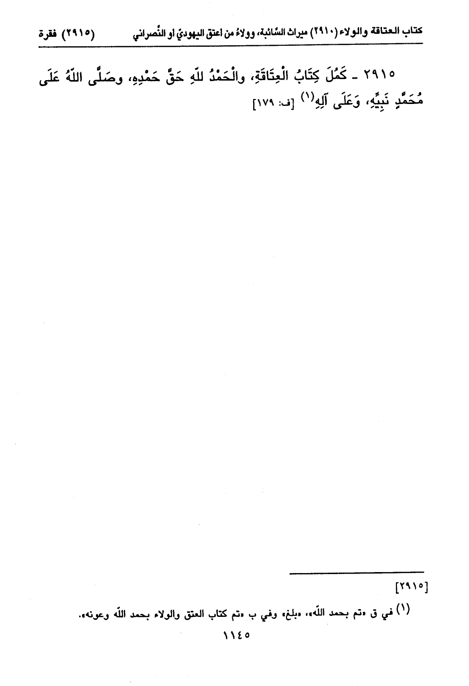 ٢٩١٥ - كَمُلَ كِتَابُ الْعِتَاقَةِ، والْحَمْدُ للهِ حَقَّ حَمْدِهِ، وصَلَّى اللهُ عَلَى مُحَمَّدٍ نَبِيِّهِ، وَعَلَى آلِهِ (١) [ف: ١٧٩]