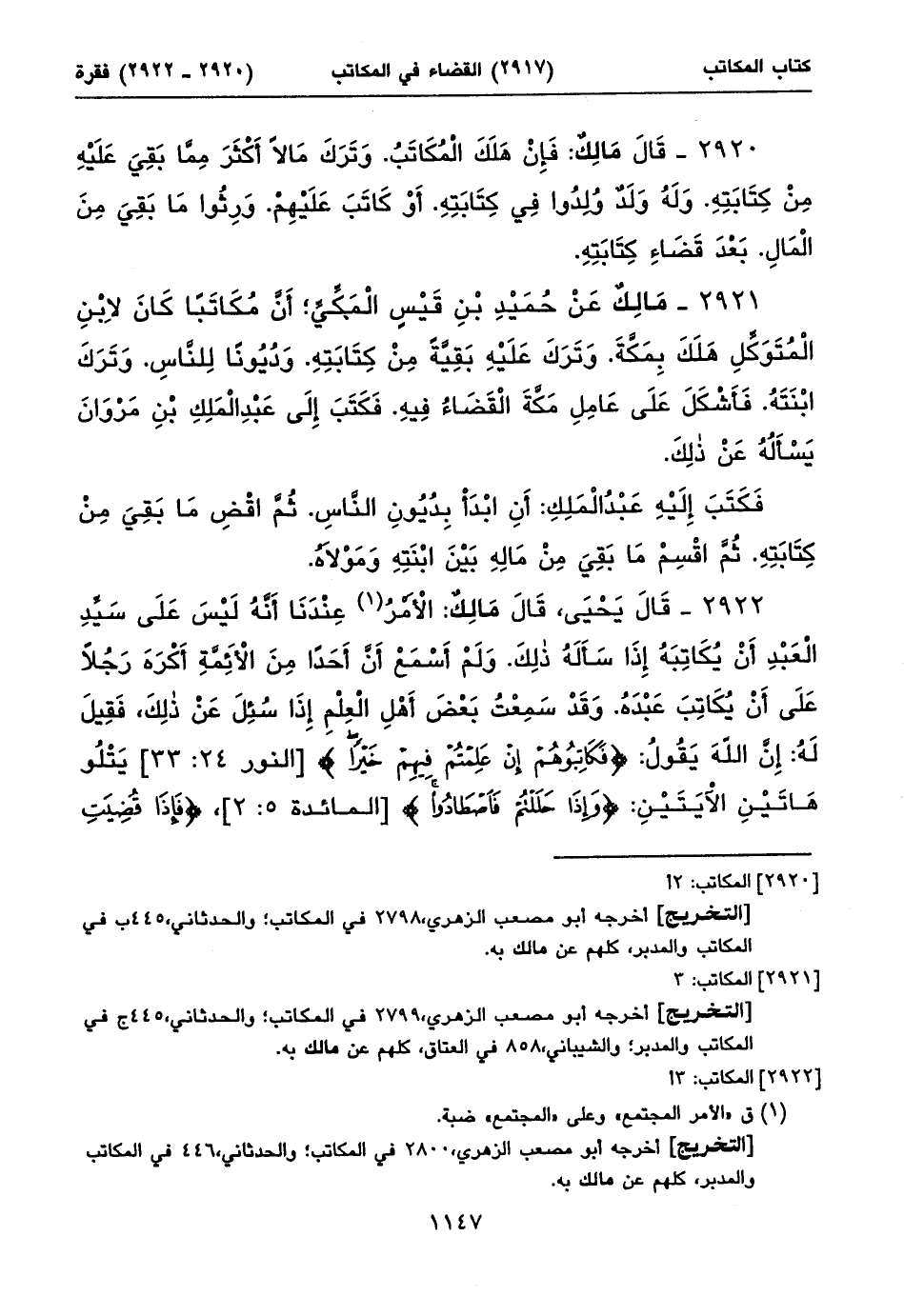 أخرجه أبو مصعب الزهري، ٢٧٩٩ في المكاتب؛ والحدثاني، ٤٤٥ج في المكاتب والمدبر؛ والشيباني، ٨٥٨ في العتاق، كلهم عن مالك به.