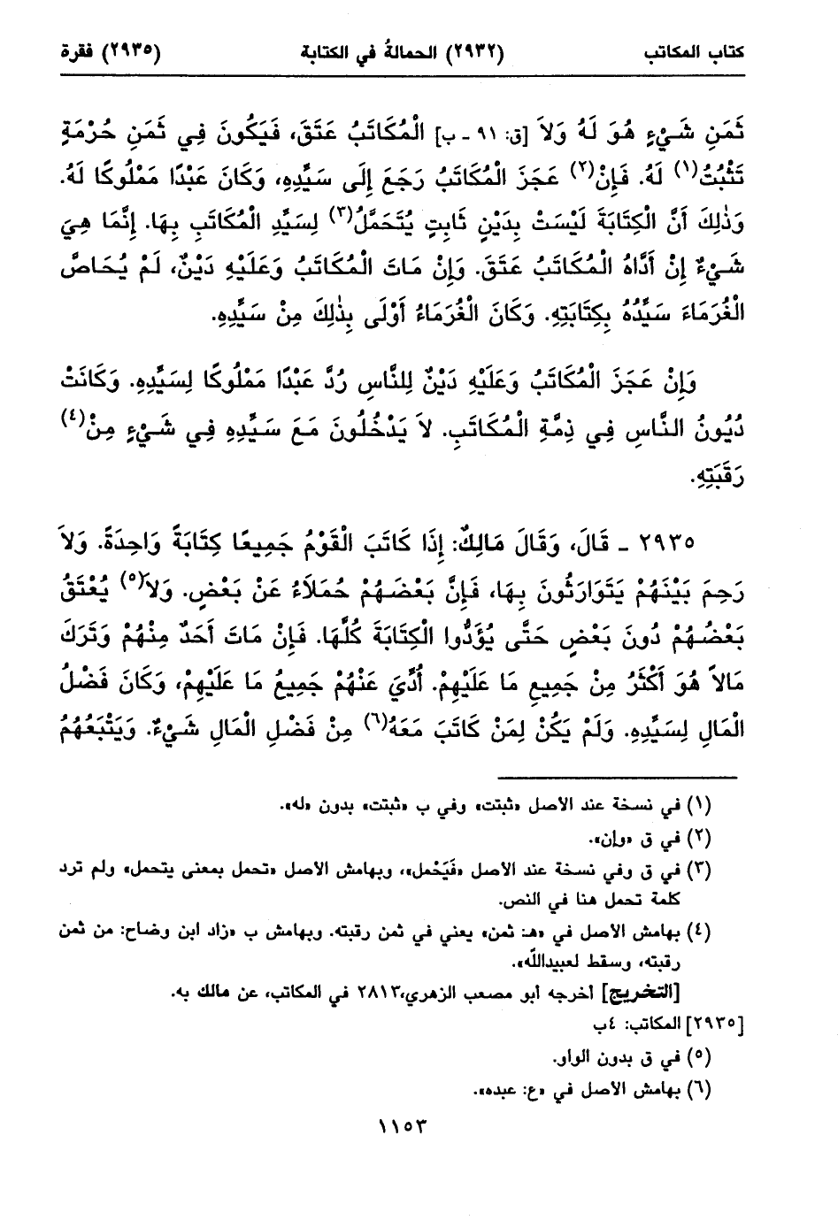 ٢٩٣٥ - قَالَ، وَقَالَ مَالِكٌ: إِذَا كَاتَبَ الْقَوْمُ جَمِيعاً كِتَابَةً وَاحِدَةً. وَلَا رَحِمَ بَيْنَهُمْ يَتَوَارَثُونَ بِهَا، فَإِنَّ بَعْضَهُمْ حُمَلَاءُ عَنْ بَعْضٍ. وَلَا (١) يُعْتَقُ بَعْضُهُمْ دُونَ بَعْضٍ حَتَّى يُؤَدُّوا الْكِتَابَةَ كُلَّهَا. فَإِنْ مَاتَ أَحَدٌ مِنْهُمْ وَتَرَكَ مَالاً هُوَ أَكْثَرُ مِنْ جَمِيعِ مَا عَلَيْهِمْ. أُدِّيَ عَنْهُمْ جَمِيعُ مَا عَلَيْهِمْ، وَكَانَ فَضْلُ الْمَالِ لِسَيِّدِهِ. وَلَمْ يَكُنْ لِمَنْ كَاتَبَ مَعَهُ (٢) مِنْ فَضْلِ الْمَالِ شَيْءٌ. وَيَتْبَعُهُمُ ⦗١١٥٤⦘ السَّيِّدُ بِحِصَصِهِمْ الَّتِي بَقِيَتْ عَلَيْهِمْ مِنَ الْكِتَابَةِ الَّتِي قُضِيَتْ مِنْ مَالِ الْهَالِكِ (٣). إِنَّمَا كَانَ حَمَلَ (٤) عَنْهُمْ، فَعَلَيْهِمْ أَنْ يُؤَدُّوا مَا عَتَقُوا بِهِ مِنْ مَالِهِ.