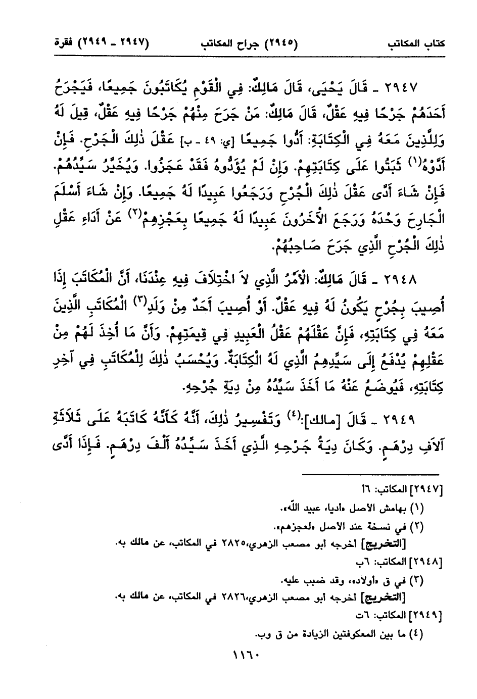 ٢٩٤٩ - قَالَ [مالك]: (١) وَتَفْسِيرُ ذلِكَ، أَنَّهُ كَأَنَّهُ كَاتَبَهُ عَلَى ثَلَاثَةِ آلَافِ دِرْهَمٍ. وَكَانَ دِيَةُ جَرْحِهِ الَّذِي أَخَذَ سَيِّدُهُ أَلْفَ دِرْهَمٍ. فَإِذَا أَدَّى ⦗١١٦١⦘ الْمُكَاتَبُ إِلَى سَيِّدِهِ أَلْفَيْ دِرْهَمٍ فَهُوَ حُرٌّ.