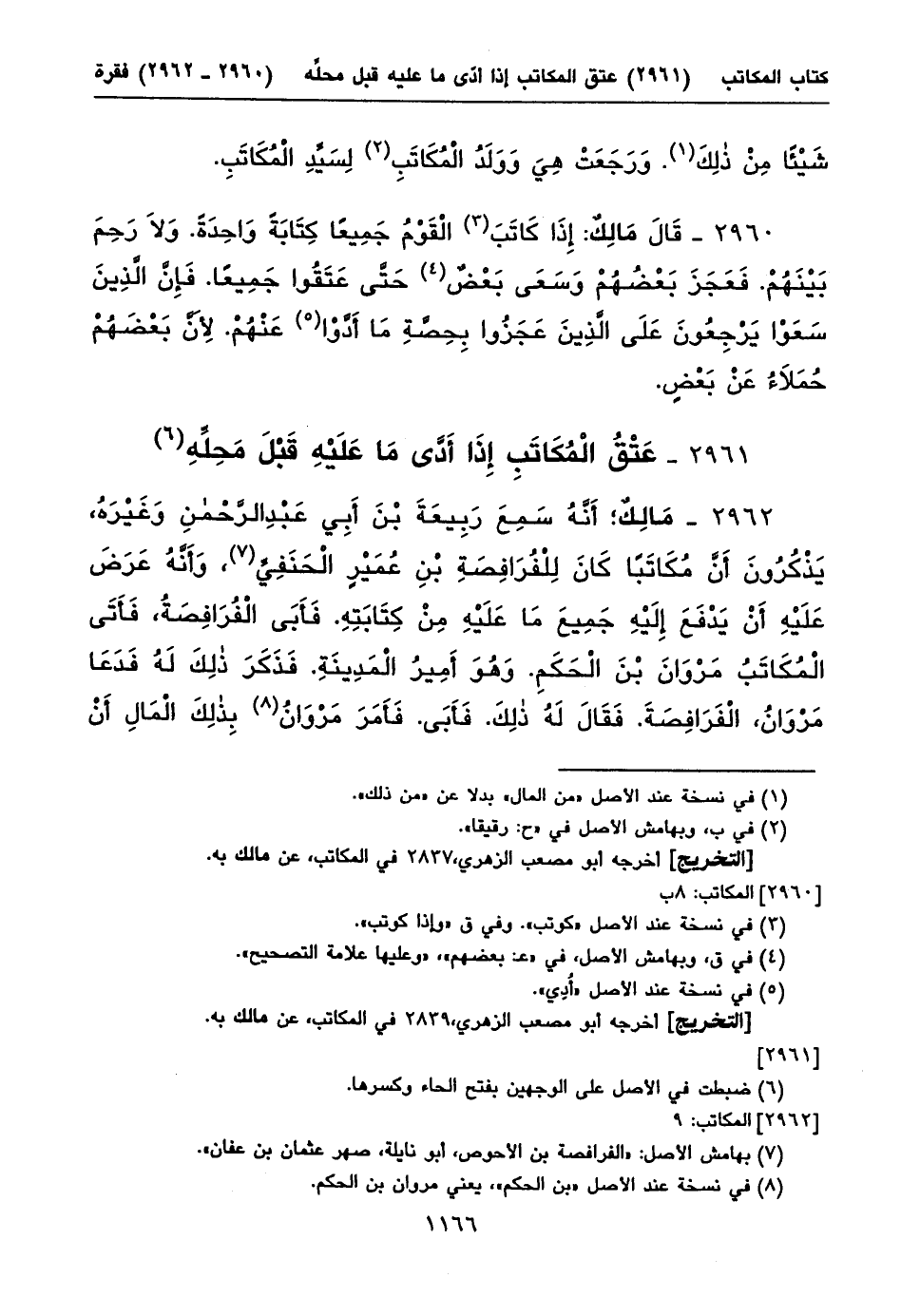 ٢٩٦٢ - مَالِكٌ؛ أَنَّهُ سَمِعَ رَبِيعَةَ بْنَ أَبِي عَبْدِ الرَّحْمنِ وَغَيْرَهُ، يَذْكُرُونَ أَنَّ مُكَاتَباً كَانَ لِلْفُرَافِصَةِ بْنِ عُمَيْرٍ الْحَنَفِيِّ (١)، وَأَنَّهُ عَرَضَ عَلَيْهِ أَنْ يَدْفَعَ إِلَيْهِ جَمِيعَ مَا عَلَيْهِ مِنْ كِتَابَتِهِ. فَأَبَى الْفُرَافِصَةُ، فَأَتَى الْمُكَاتَبُ مَرْوَانَ بْنَ الْحَكَمِ. وَهُوَ أَمِيرُ الْمَدِينَةِ. فَذَكَرَ ذلِكَ لَهُ فَدَعَا مَرْوَانُ، الْفَرَافِصَةَ. فَقَالَ لَهُ ذلِكَ. فَأَبَى. فَأَمَرَ مَرْوَانُ (٢) بِذلِكَ الْمَالِ أَنْ ⦗١١٦٧⦘ يُقْبَضَ مِنَ الْمُكَاتَبِ، فَوُضِعَ (٣) فِي بَيْتِ الْمَالِ. وَقَالَ لِلْمُكَاتَبِ: اذْهَبْ فَقَدْ عَتَقْتَ. فَلَمَّا رَأَى ذلِكَ الْفُرَافِصَةُ، قَبَضَ الْمَالَ.