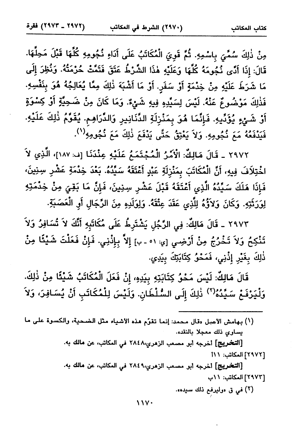 ٢٩٧٣ - قَالَ مَالِكٌ: فِي الرَّجُلِ يَشْتَرِطُ عَلَى مُكَاتَبِهِ أَنَّكَ لَا تُسَافِرُ وَلَا تَنْكِحُ وَلَا تَخْرُجُ مِنْ أَرْضِي [ي: ٥١ - ب] إِلَاّ بِإِذْنِي. فَإِنْ فَعَلْتَ شَيْئاً مِنْ ذلِكَ بِغَيْرِ إِذْنِي، فَمَحْوُ كِتَابَتِكَ بِيَدِي.