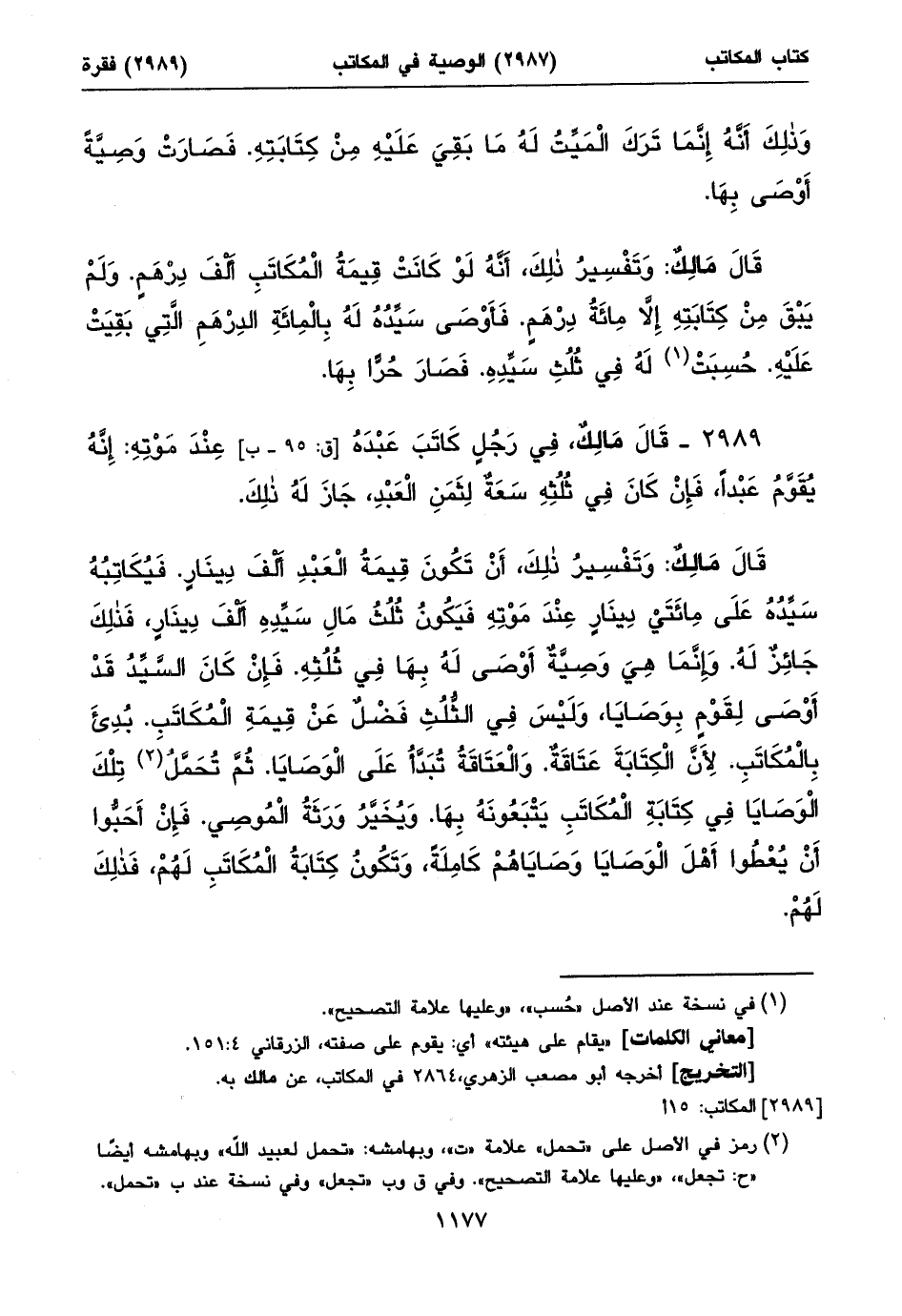 ٢٩٨٩ - قَالَ مَالِكٌ، فِي رَجُلٍ كَاتَبَ عَبْدَهُ [ق: ٩٥ - ب] عِنْدَ مَوْتِهِ: إِنَّهُ يُقَوَّمُ عَبْداً، فَإِنْ كَانَ فِي ثُلُثِهِ سَعَةٌ لِثَمَنِ الْعَبْدِ، جَازَ لَهُ ذلِكَ.