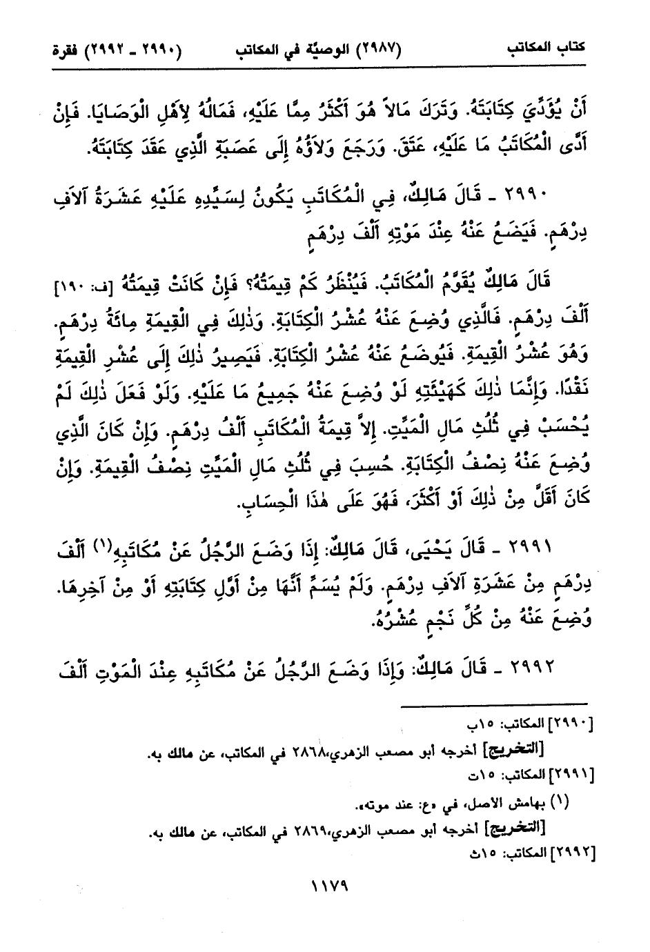 ٢٩٩٠ - قَالَ مَالِكٌ، فِي الْمُكَاتَبِ يَكُونُ لِسَيِّدِهِ عَلَيْهِ عَشَرَةُ آلَافِ دِرْهَمٍ. فَيَضَعُ عَنْهُ عِنْدَ مَوْتِهِ أَلْفَ دِرْهَمٍ