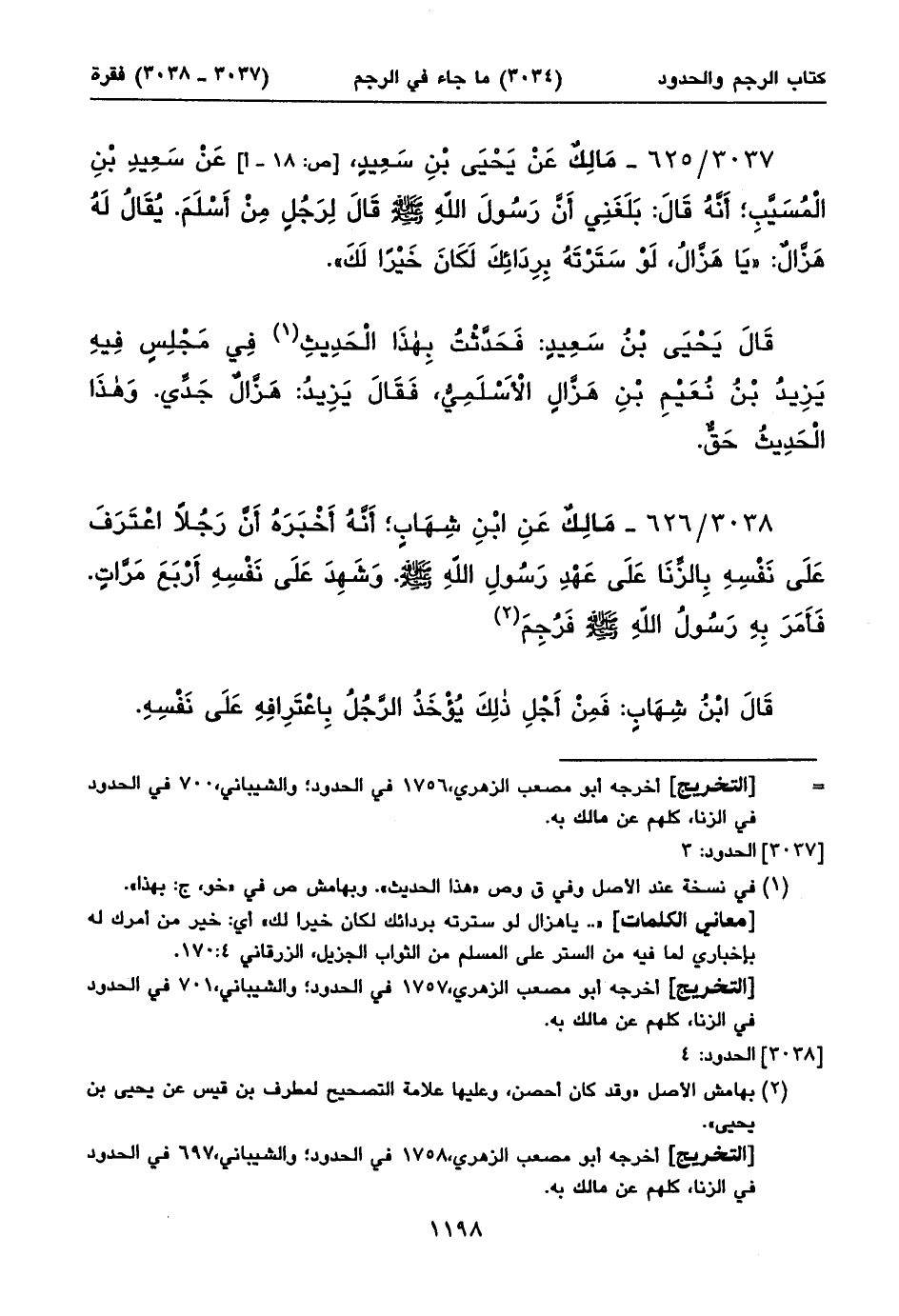 ٣٠٣٨/ ٦٢٦ - مَالِكٌ عَنِ ابْنِ شِهَابٍ؛ أَنَّهُ أَخْبَرَهُ أَنَّ رَجُلاً اعْتَرَفَ عَلَى نَفْسِهِ بِالزِّنَا عَلَى عَهْدِ رَسُولِ اللهِ صلى الله عليه وسلم. وَشَهِدَ عَلَى نَفْسِهِ أَرْبَعَ مَرَّاتٍ. فَأَمَرَ بِهِ رَسُولُ اللهِ صلى الله عليه وسلم فَرُجِمَ (١)