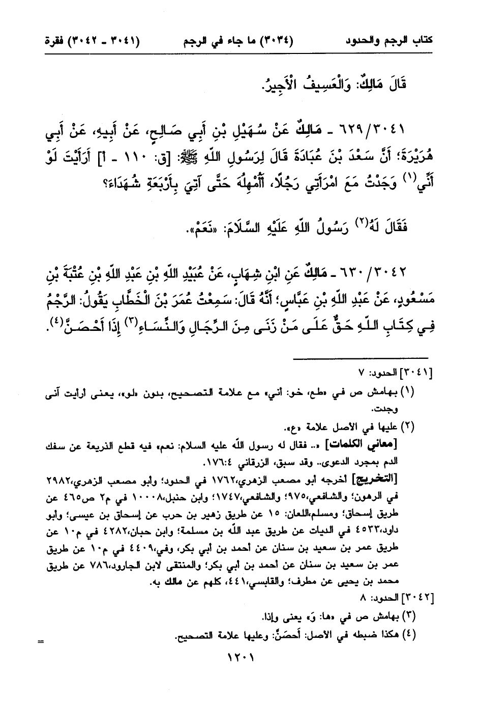 ٣٠٤١/ ٦٢٩ - مَالِكٌ عَنْ سُهَيْلِ بْنِ أَبِي صَالِحٍ، عَنْ أَبِيهِ، عَنْ أَبِي هُرَيْرَةَ؛ أَنَّ سَعْدَ بْنَ عُبَادَةَ قَالَ لِرَسُولِ اللهِ صلى الله عليه وسلم: [ق: ١١٠ - أ] أَرَأَيْتَ لَوْ أَنِّي (١) وَجَدْتُ مَعَ امْرَأَتِي رَجُلاً، أَأُمْهِلُهَ حَتَّى آتِيَ بِأَرْبَعَةِ شُهَدَاءَ؟