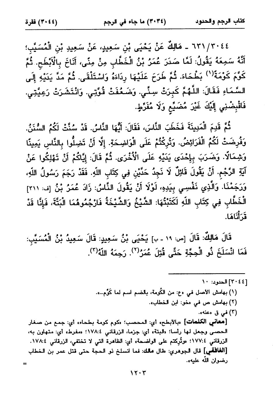 وقال مالك، قال يحيى بن سعيد، قال سعيد بن المسيب: «فما انسلخ ذو الحجة حتى قتل عمر رضي الله عنه. «قال مالك: يريد عمر بن الخطاب بالشيخ والشيخة: الثيب من الرجال، والثيبة من النساء»، «وفي رواية ابن القاسم: ورجمنا بعده. وهذا حديث مرسل، أدخله النسائي في المسند»، مسند الموطأ صفحة٢٧٧ - ٢٧٨