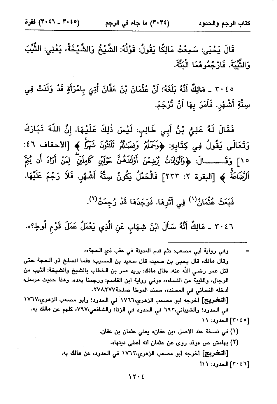 ٣٠٤٥ - مَالِكٌ أَنَّهُ بَلَغَهُ؛ أَنَّ عُثْمَانَ بْنَ عَفَّانَ أُتِيَ بِامْرَأَةٍ قَدْ وَلَدَتْ فِي سِتَّةِ أَشْهُرٍ. فَأَمَرَ بِهَا أَنْ تُرْجَمَ.