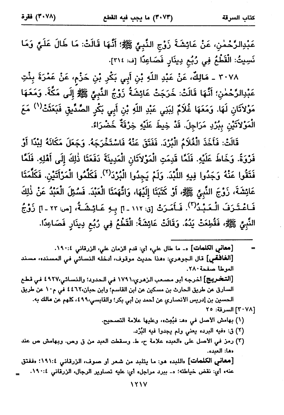 قَالَتْ: فَأَخَذَ الْغُلَامُ الْبُرْدَ. فَفَتَقَ عَنْهُ فَاسْتَخْرَجَهُ. وَجَعَلَ مَكَانَهُ لِبْداً أَوْ فَرْوَةً. وَخَاطَ عَلَيْهِ. فَلَمَّا قَدِمَتِ الْمَوْلَاتَانِ الْمَدِينَةَ دَفَعَتَا ذلِكَ إِلَى أَهْلِهِ. فَلَمَّا فَتَقُوا عَنْهُ وَجَدُوا فِيهِ اللِّبْدَ. وَلَمْ يَجِدُوا الْبُرْدَ (٢). فَكَلَّمُوا الْمَرْأَتَيْنِ. فَكَلَّمَتَا عَائِشَةَ، زَوْجَ النَّبِيَِ صلى الله عليه وسلم، أَوْ كَتَبَتَا إِلَيْهَا، وَاتَّهَمَتَا الْعَبْدَ. فَسُئِلَ الْعَبْدُ عَنْ ذلِكَ فَاعْتَرَفَ الْعَبْدُ (٣). فَأَمَرَتْ [ق: ١١٢ - أ] بِهِ عَائِشَةُ، [ص: ٢٣ - أ] زَوْجُ النَّبِيِّ صلى الله عليه وسلم، فَقُطِعَتْ يَدُهُ. وَقَالَتْ عَائِشَةُ: الْقَطْعُ فِي رُبُعِ دِينَارٍ فَصَاعِداً.