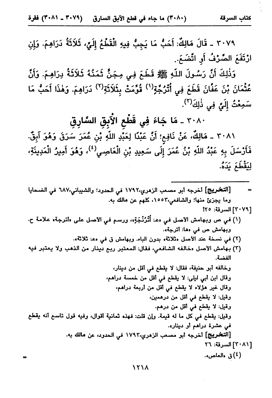 وَذلِكَ أَنَّ رَسُولَ اللهِ صلى الله عليه وسلم قَطَعَ فِي مِجَنٍّ ثَمَنُهُ ثَلَاثَةُ دِرَاهِمَ. وَأَنَّ عُثْمَانَ بْنَ عَفَّانَ قَطَعَ فِي أُتْرُجَّةٍ (١) قُوِّمَتْ بِثَلَاثَةِ (٢) دَرَاهِمَ. وَهذَا أَحَبُّ مَا سَمِعْتُ إِلَيَّ فِي ذلِكَ (٣).