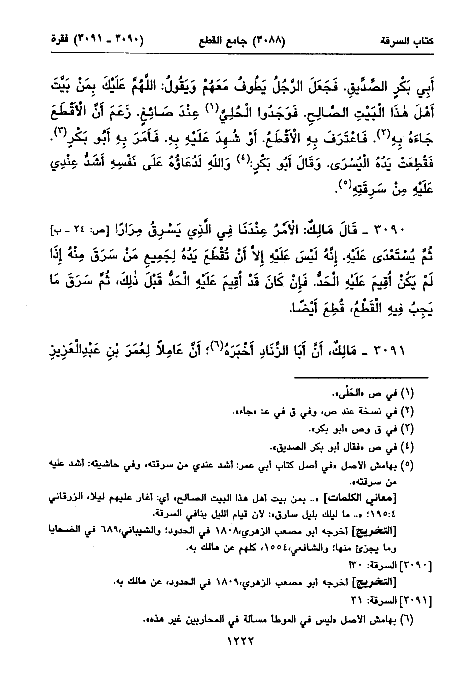 ٣٠٩١ - مَالِكٌ، أَنَّ أَبَا الزِّنَادِ أَخْبَرَهُ (١)؛ أَنَّ عَامِلاً لِعُمَرَ بْنِ عَبْدِ الْعَزِيزِ ⦗١٢٢٣⦘ أَخَذَ نَاساً فِي حِرَابَةٍ (٢) وَلَمْ يَقْتُلُوا. فَأَرَادَ أَنْ يَقْطَعَ أَيْدِيَهُمْ أَوْ يَقْتُلَ (٣). فَكَتَبَ إِلَى عُمَرَ بْنِ عَبْدِ الْعَزِيزِ فِي ذلِكَ. فَكَتَبَ إِلَيْهِ عُمَرُ بْنُ عَبْدِ الْعَزِيزِ: لَوْ أَخَذْتَ بِأَيْسَرِ ذلِكَ.