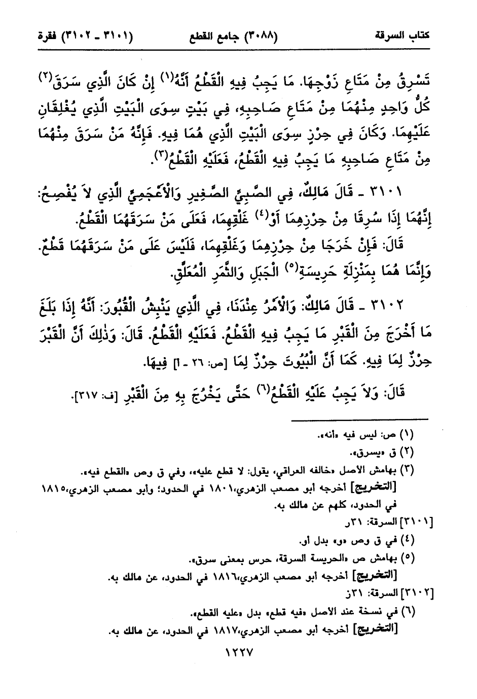 ٣١٠٢ - قَالَ مَالِكٌ: وَالْأَمْرُ عِنْدَنَا، فِي الَّذِي يَنْبِشُ الْقُبُورَ: أَنَّهُ إِذَا بَلَغَ مَا أَخْرَجَ مِنَ الْقَبْرِ مَا يَجِبُ فِيهِ الْقَطْعُ. فَعَلَيْهِ الْقَطْعُ. قَالَ: وَذلِكَ أَنَّ الْقَبْرَ حِرْزٌ لِمَا فِيهِ. كَمَا أَنَّ الْبُيُوتَ حِرْزٌ لِمَا [ص: ٢٦ - أ] فِيهَا.