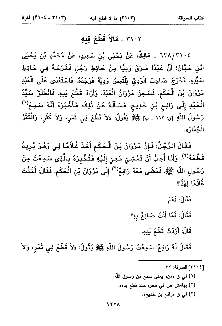 ٣١٠٤/ ٦٣٨ - مَالِكٌ، عَنْ يَحْيَى بْنِ سَعِيدٍ، عَنْ مُحَمَّدِ بْنِ يَحْيَى ابْنِ حَبَّانَ؛ أَنَّ عَبْداً سَرَقَ وَدِيّاً مِنْ حَائِطِ رَجُلٍ فَغَرَسَهُ فِي حَائِطِ سَيِّدِهِ. فَخَرَجَ صَاحِبُ الْوَدِيِّ يَلْتَمِسُ وَدِيَّهُ فَوَجَدَهُ. فَاسْتَعْدَى عَلَى الْعَبْدِ مَرْوَانَبْنَ الْحَكَمِ. فَسَجَنَ مَرْوَانُ الْعَبْدَ. وَأَرَادَ قَطْعَ يَدِهِ. فَانْطَلَقَ سَيِّدُ الْعَبْدِ إِلَى رَافِعِبْنِ خَدِيجٍ.