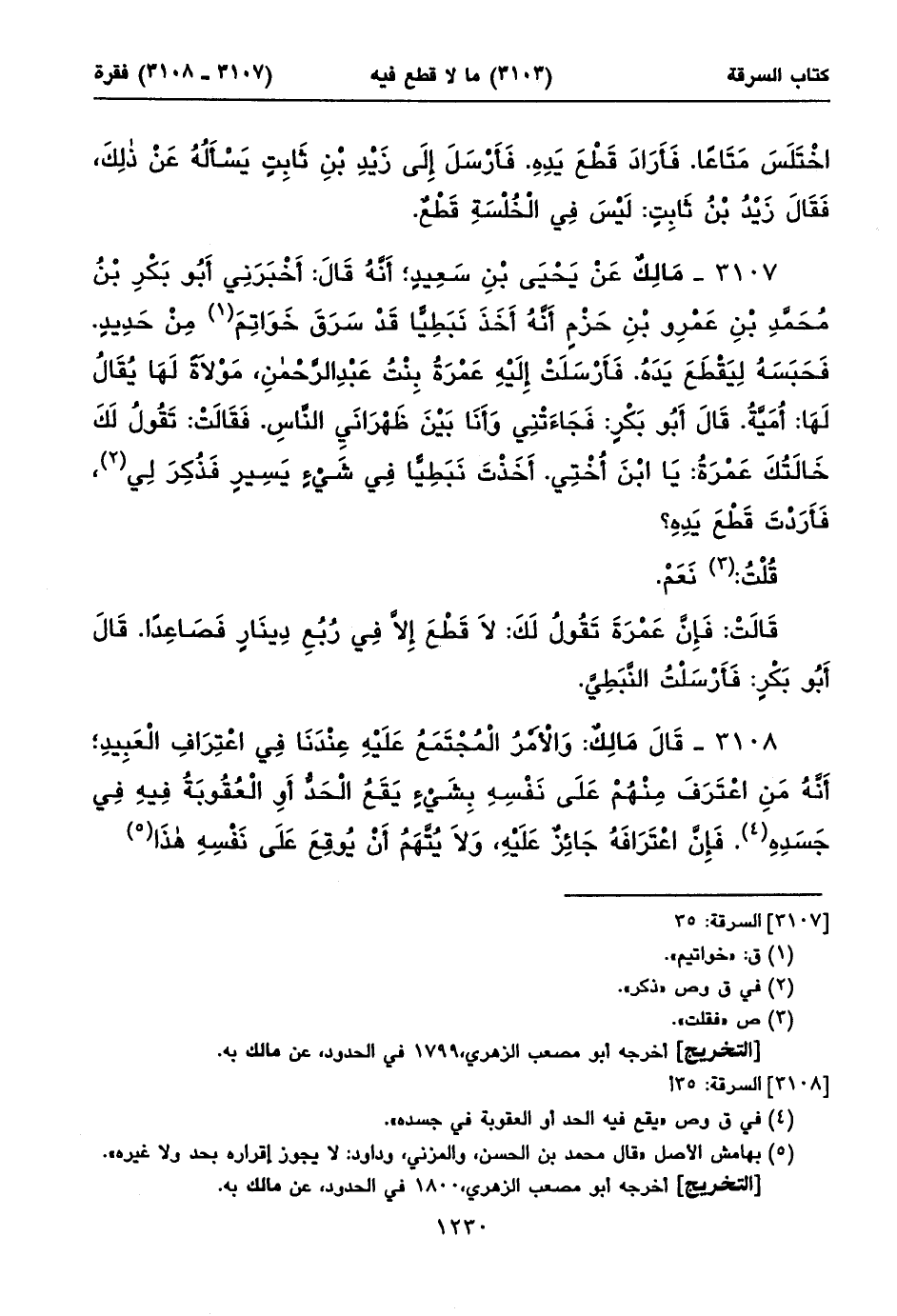 ٣١٠٧ - مَالِكٌ عَنْ يَحْيَى بْنِ سَعِيدٍ؛ أَنَّهُ قَالَ: أَخْبَرَنِي أَبُو بَكْرِ بْنُ مُحَمَّدِ بْنِ عَمْرِو بْنِ حَزْمٍ أَنَّهُ أَخَذَ نَبَطِيّاً قَدْ سَرَقَ خَوَاتِمَ (١) مِنْ حَدِيدٍ. فَحَبَسَهُ لِيَقْطَعَ يَدَهُ. فَأَرْسَلَتْ إِلَيْهِ عَمْرَةُ بِنْتُ عَبْدِ الرَّحْمنِ، مَوْلَاةً لَهَا يُقَالُ لَهَا: أُمَيَّةُ. قَالَ أَبُو بَكْرٍ: فَجَاءَتْنِي وَأَنَا بَيْنَ ظَهْرَانَيِ النَّاسِ. فَقَالَتْ: تَقُولُ لَكَ خَالَتُكَ عَمْرَةُ: يَا ابْنَ أُخْتِي. أَخَذْتَ نَبَطِيّاً فِي شَيْءٍ يَسِيرٍ فَذُكِرَ لِي (٢)، فَأَرَدْتَ قَطْعَ يَدِهِ؟