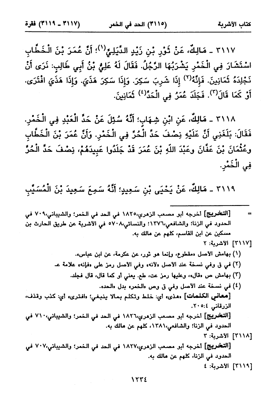 ٣١١٧ - مَالِكٌ، عَنْ ثَوْرِ بْنِ زَيْدٍ الدِّيَلِيِّ (١)؛ أَنَّ عُمَرَ بْنَ الْخَطَّابِ اسْتَشَارَ فِي الْخَمْرِ يَشْرَبُهَا الرَّجُلُ. فَقَالَ لَهُ عَلِيُّ بْنُ أَبِي طَالِبٍ: نَرَى أَنْ نَجْلِدَهُ ثَمَانِينَ. فَإِنَّهُ (٢) إِذَا شَرِبَ سَكِرَ. وَإِذَا سَكِرَ هَذَيَ. وَإِذَا هَذَيَ افْتَرَى. أَوْ كَمَا قَالَ (٣). فَجَلَدَ عُمَرُ فِي الْحَدِّ (٤) ثَمَانِينَ.